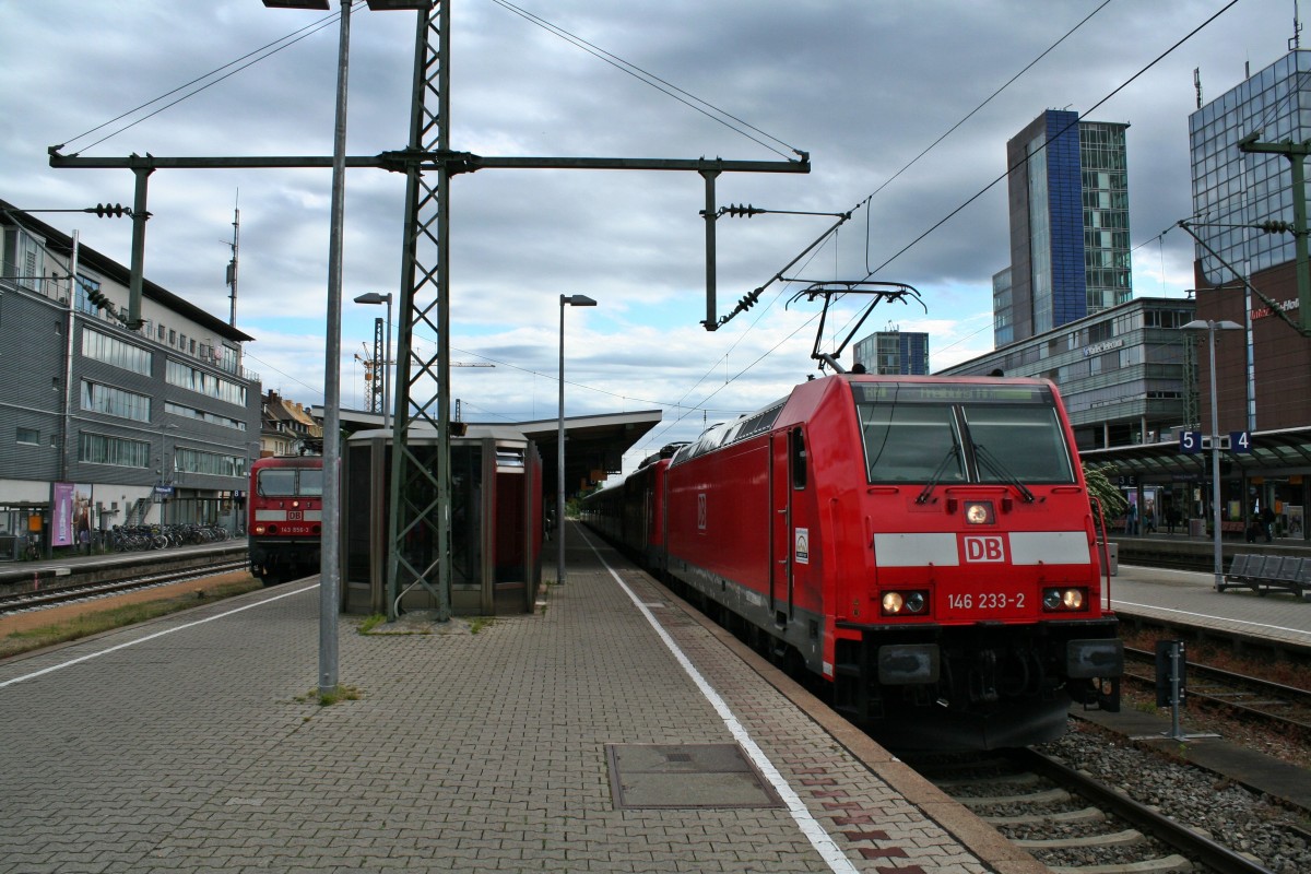 143 233-2 schleppte am Morgen des 24.05.14 den mit 111 062-6 bespannten RE 26701 von Offenburg nach Freiburg (Breisgau) Hbf. Hier konnte ich den Zug kurz nach der Ankunft in seinem Zielbahnhof fotografieren.