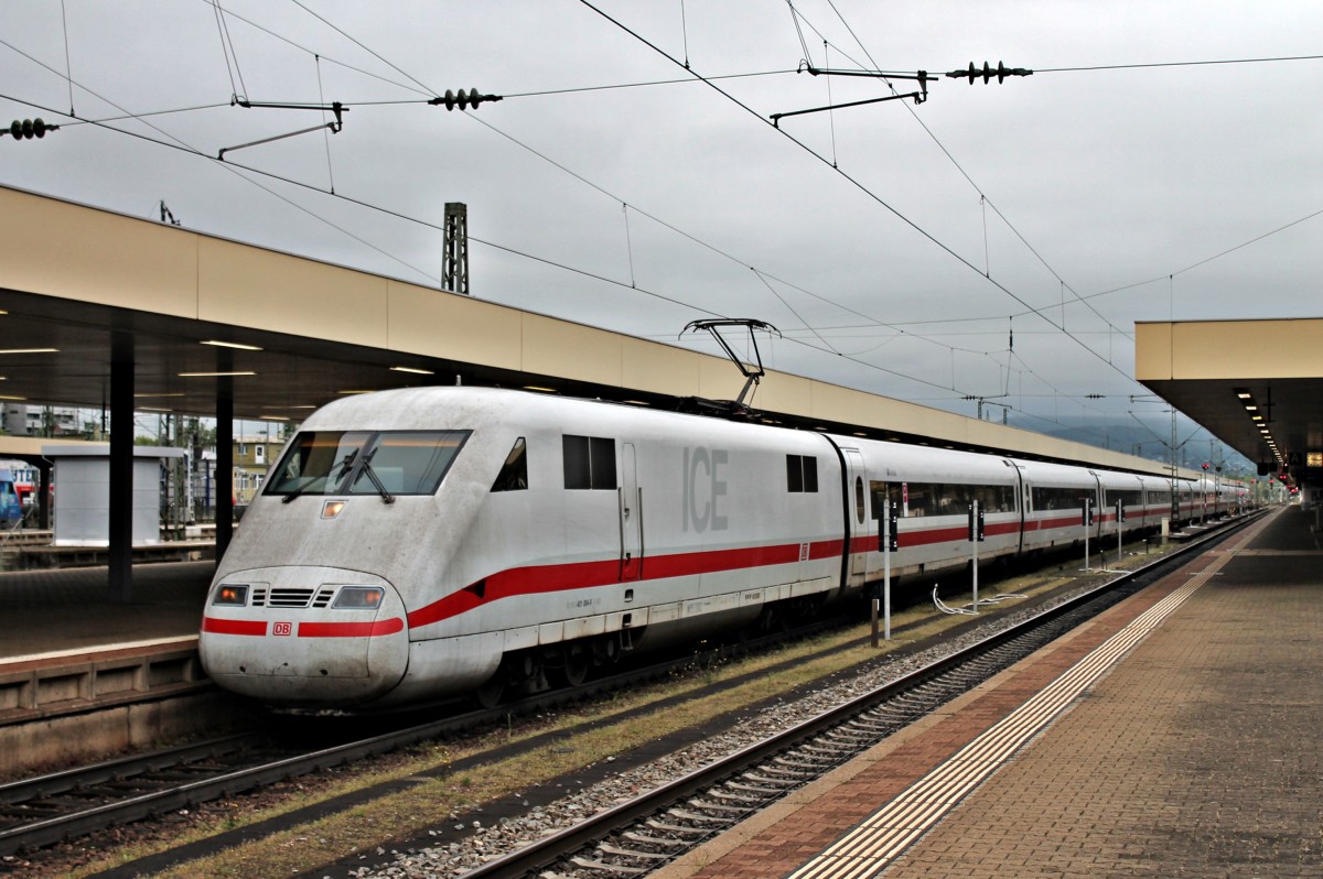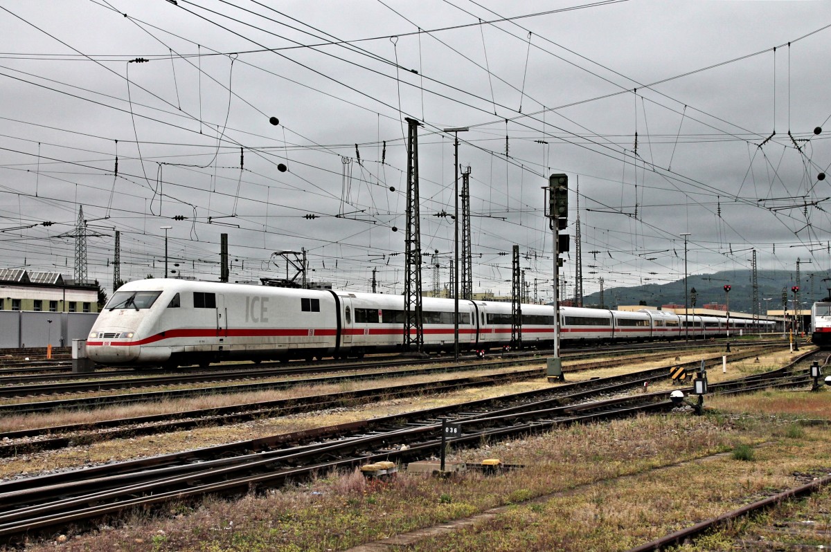 Ausfahrt am Morgen des 02.05.2014 von 401 586-3 als ICE 372 (Interlaken Ost - Berlin Hbf (tief)) aus dem Badischen Bahnhof von Basel in Richtung Freiburg.