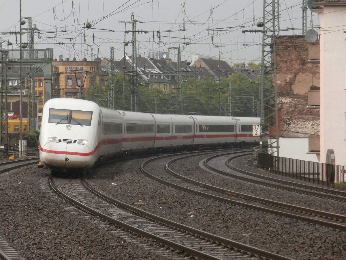 402er ICE kommt gerade vom Düsseldorfer HBF nach Köln durch Düsseldorf Volksgarten gefahren. An diesen Wochenende fahren die 402er alle als Doppeltraktion. Hier bei einem Regenschauer am 13.7.14