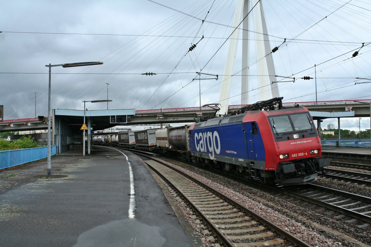 482 006-4 mit einem KLV-Zug auf dem Weg in Richtung Rheinstrecke am Morgen des 24.05.14 im Bahnhof Ludwigshafen am Rhein.