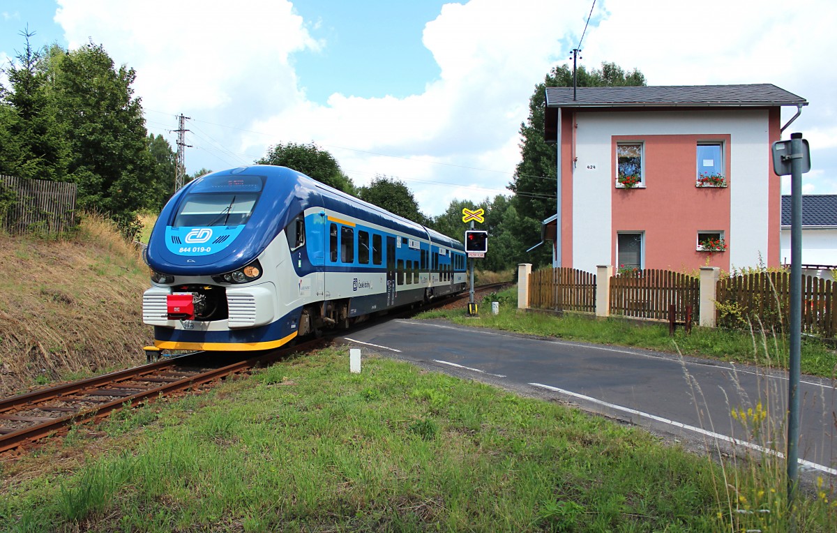 844 019-0 fährt am 11.07.2014 mit dem Os 17214 nach As mesto am ehem. Schrankenposten in Hazlov vorbei. Leider stört das Straßenschild den Gesamteindruck etwas.