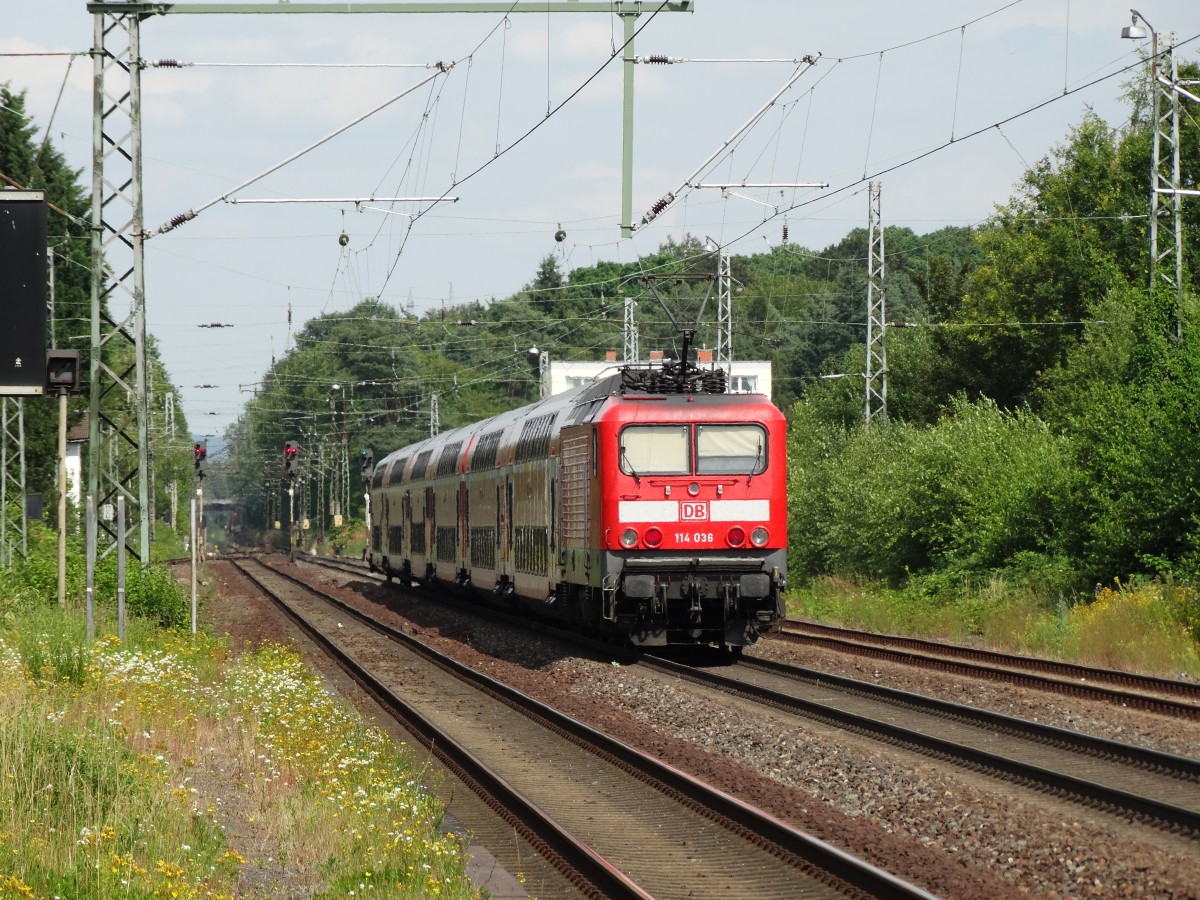 DB Regio Hessen 114 036 schiebt am 27.06.14 in Maintal Ost ein RE nach Fulda