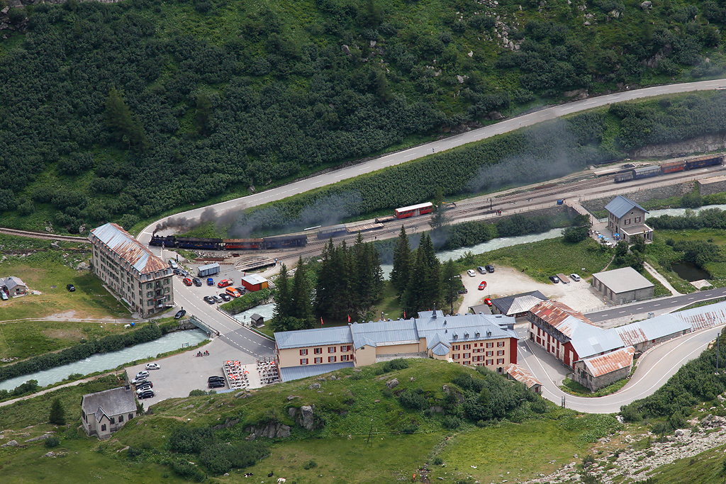 DFB-Dampfzug verlässt gerade den Bahnhof Gletsch und wird nach Einklinken in die Zahnstangen in Richtung Furka-Passhöhe und Realp fahren. Auf Velotour den Grimselpass hoch, 24. Juli 2013, 14:25