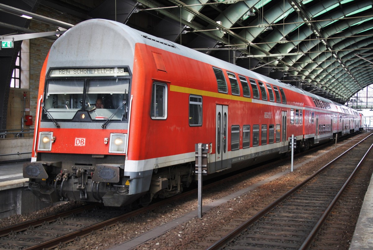 Hier eine RB14 (RB18915) "Airport-Express" von Nauen nach Berlin Schönefeld Flughafen, dieser Zug stand am 28.6.2014 in Berlin Ostbahnhof. Schublok war 143 333-3.