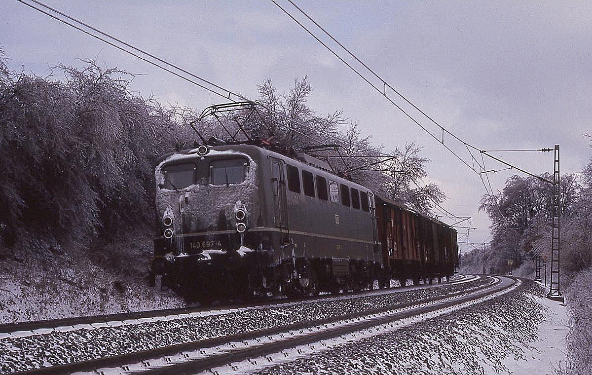 Nach dem Eisregen am 2.3.1987 auf der Rollbahn dauerte es am Folgetag bis in den Vormittag, ehe die Strecke wieder befahren werden konnte. Erster Zug Richtung Münster war dabei a, 3.3.1987 um 11.03 Uhr die noch total vereiste 140697 mit ein paar gedeckten Güterwagen.
