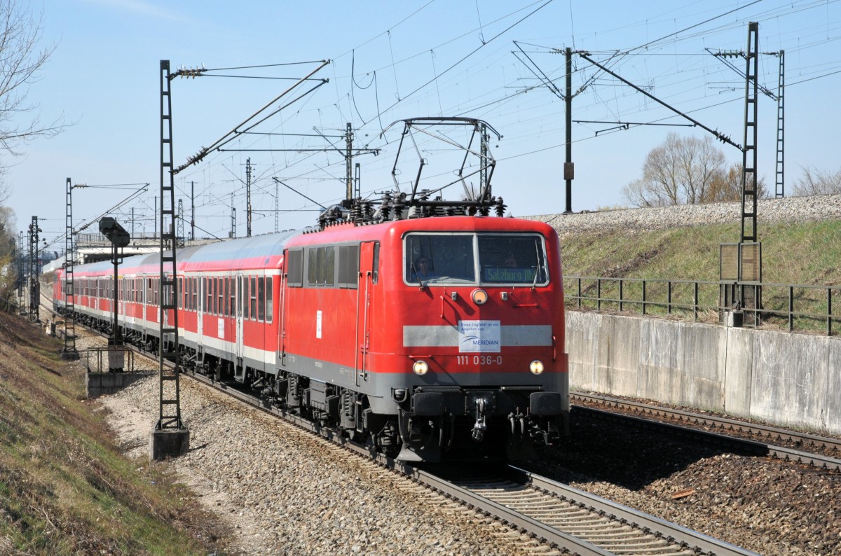 Nun sind alle Meridian-1430er im Einsatz. Zum alten Eisen gehört da 111 036 am 29.03.14 bei Waldtrudering/München