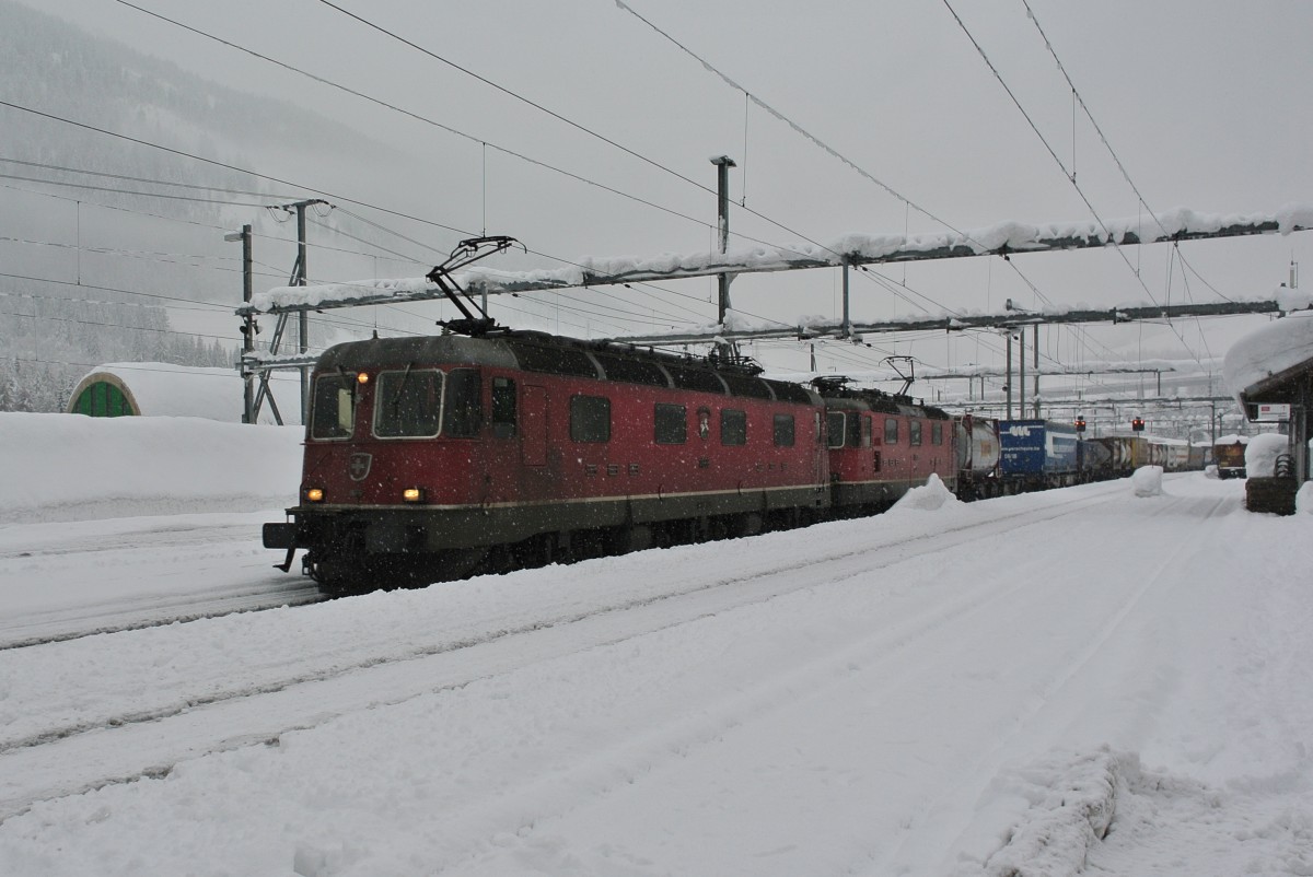 Re 6/6 11666 und Re 4/4 II 11329 mit Güterzug bei Durchfahrt in Airolo, 07.02.2014.
