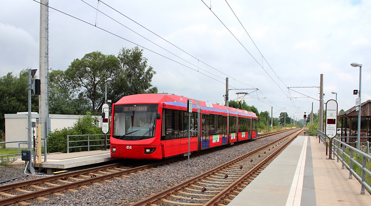 Variobahn 414 steht am 12.07.2014 mit der CB 56029 von Chemnitz Hbf nach Stollberg(Sachs) in dem Kreuzungsbahnhof Pfaffenhain.