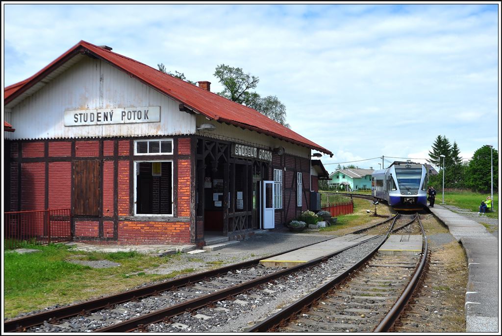 Gleich drei GTW treffen sich in Studený Potok. Links der 840 006-5 nach Tatranská Lomnica, in der Mitte der 840 004-0 nach Kezmarok und rechts der 840 005-7 nach Poprad Tatry. (04.06.2014)
