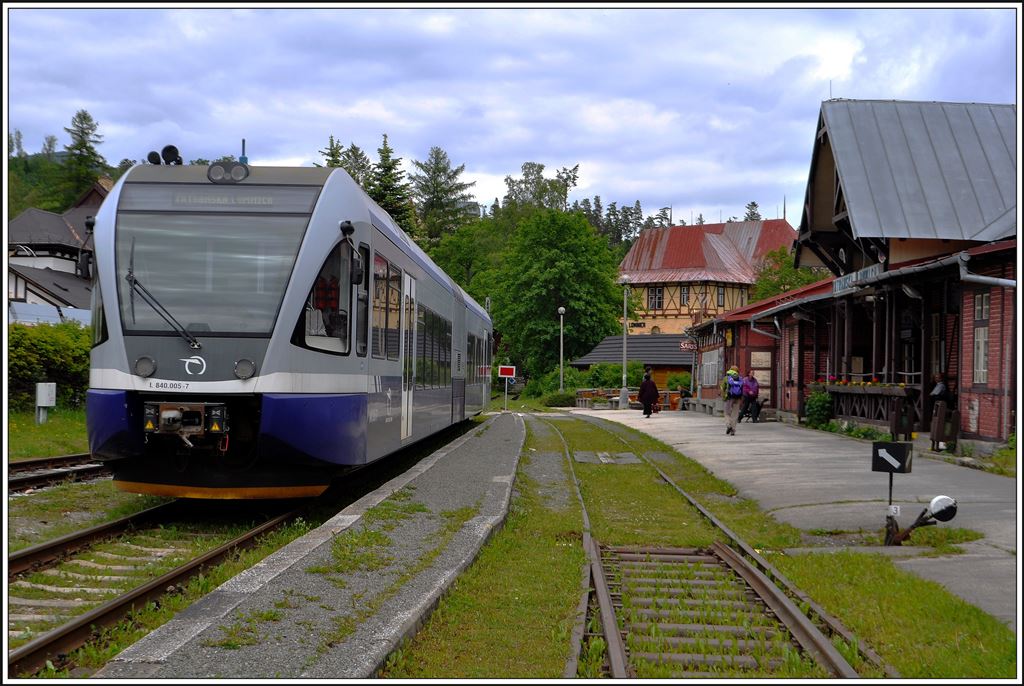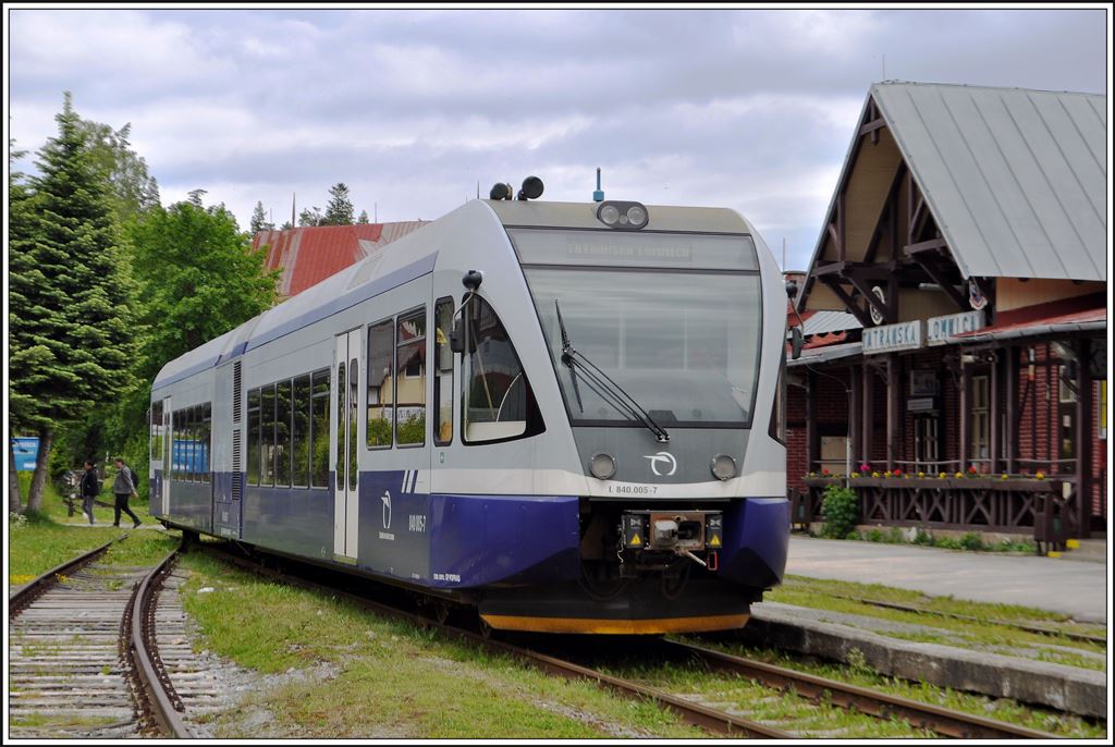 Schmal- und Normalspur sind in der Hohen Tatra fest in Stadlerhand. 425.957-8 trifft in Tatranská Lomnica auf den 840 005-7. (04.06.2014)