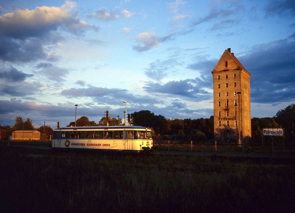Der PEG-Schienenbus hat gerade einen Halt in Blumenthal eingelegt und rollt weiter nach Neustadt (Dosse), 02.09.2003