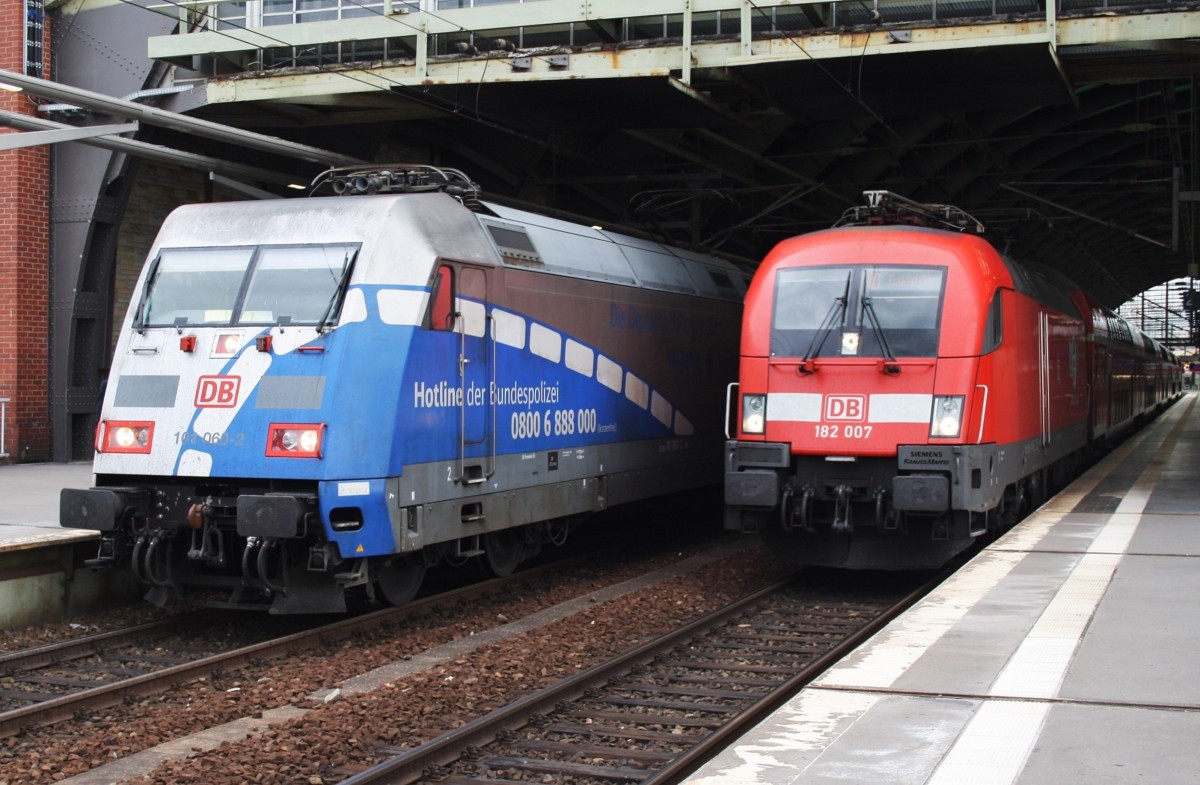 Hier links 101 060-2 mit IC2431 von Emden Außenhafen nach Berlin Ostbahnhof und rechts 182 007 mit einem RE1 (RE18127) von Magdeburg Hbf. nach Frankfurt(Oder), diese beiden Züge begegneten sich am 28.6.2014 in Berlin Hbf.