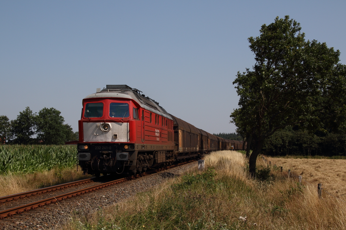 Marschbahnumleiter: In der Mittagssonne am 19.07.2014 ist 232 241-0 aus Esbjerg in Dänemark kommend auf dem Weg in Richtung Süden. Fotografiert am Bahnübergang der kleinen Ortschaft Holm zwischen Niebüll und Uphusum.
