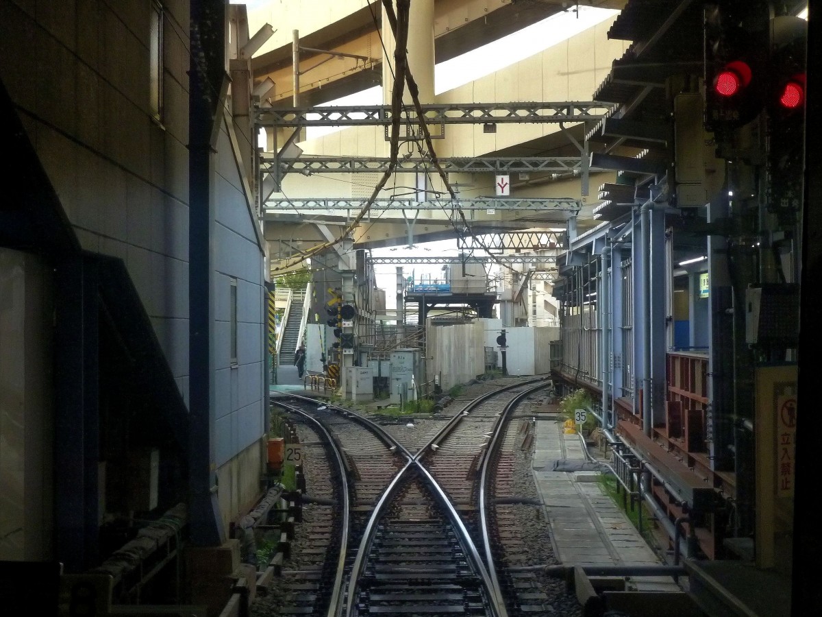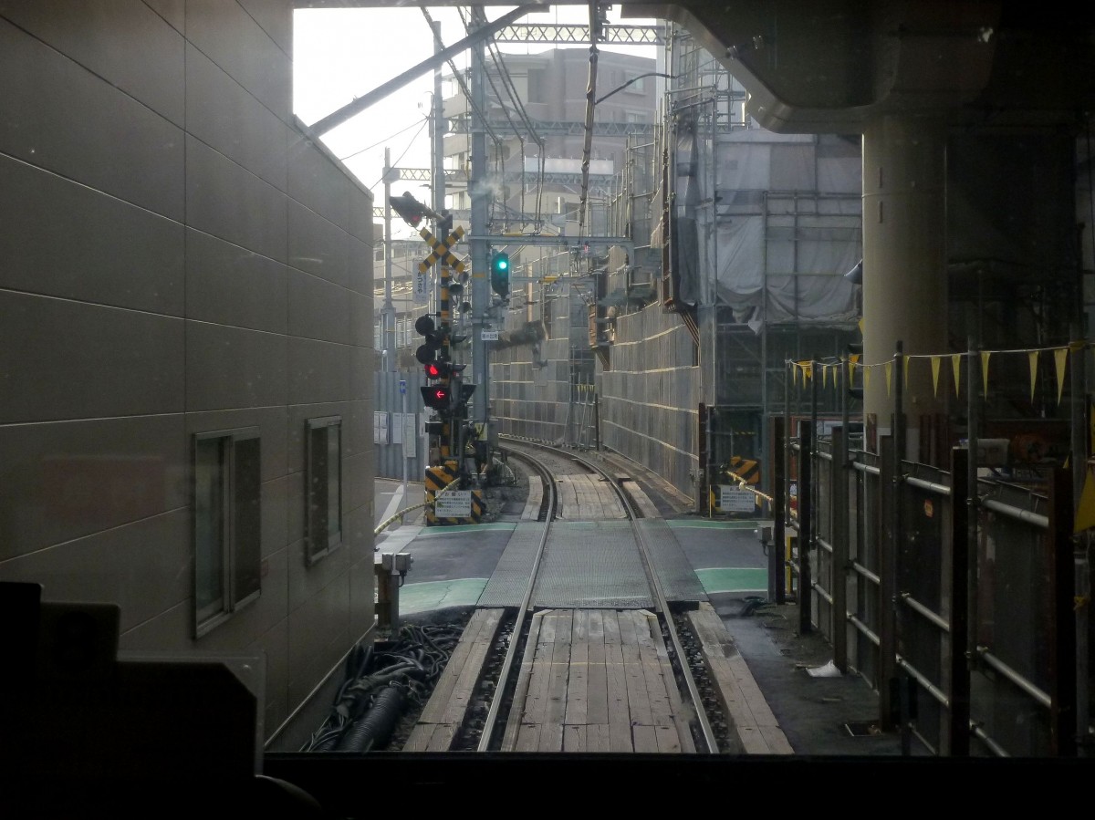 Zweiglinien des Keikyû-Konzerns - die Haneda-Linie: Die Abzweigung der Haneda-Linie in Tokyo-Kamata. Noch wenige Monate fahren die Züge stadtauswärts ebenerdig und über gefährliche Strassenkreuzungen, während stadteinwärts die mit gewaltigem Aufwand erstellte Hochstrecke bereits in Betrieb ist. Blick durchs verglaste Führerstandrückfenster eines Keikyû-Zugs, 25.Oktober 2011.