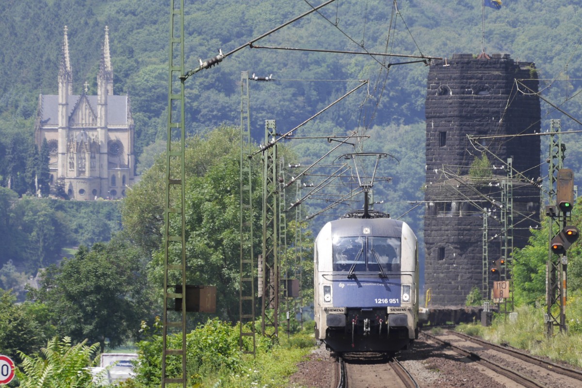 1216 951 der Wiener Lokalbahnen auf der rechten Rheinstrecke, eingerahmt von Remagens beiden Sehenswürdigkeiten, der Apollinaris-Kirche auf dem linken Rheinufer und dem rechtsrheinischen Brückenkopf der ehemaligen Eisenbahnbrücke (Erpel/Rhein, 24.7.14).