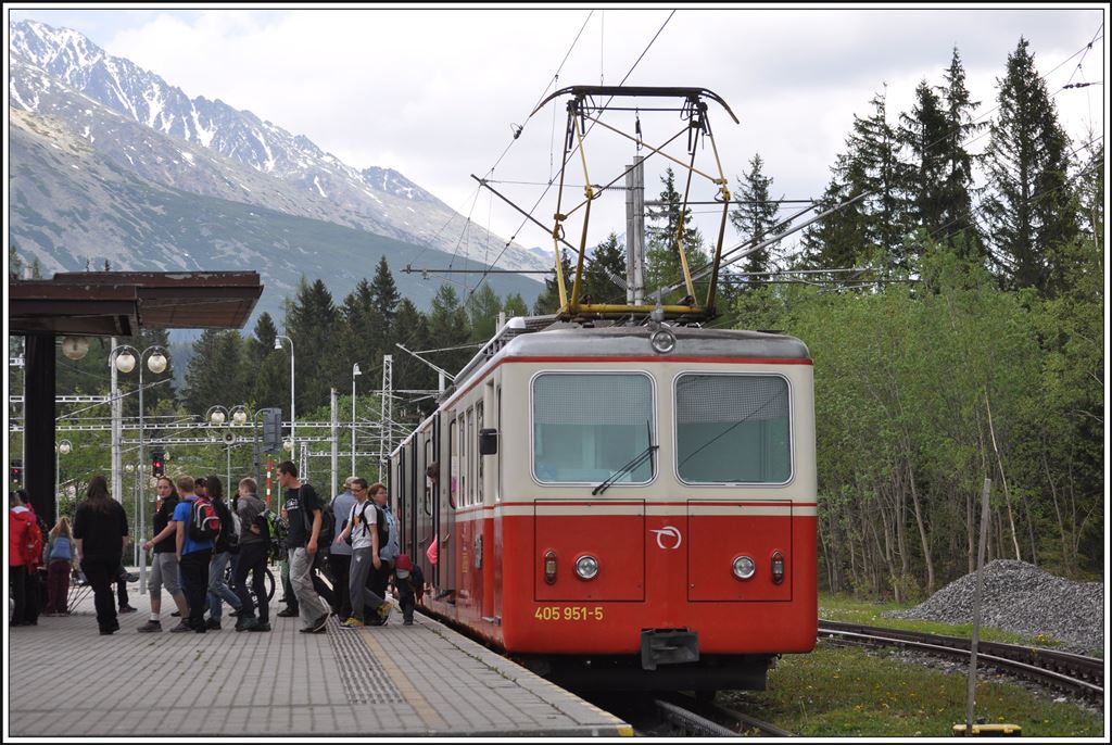 405 951-5 der Zahnradbahn von Štrba trifft in Štrbské Pleso auf die GTW der Adhäsionsstrecke Richtung Starý Smokovec. (05.06.2014)