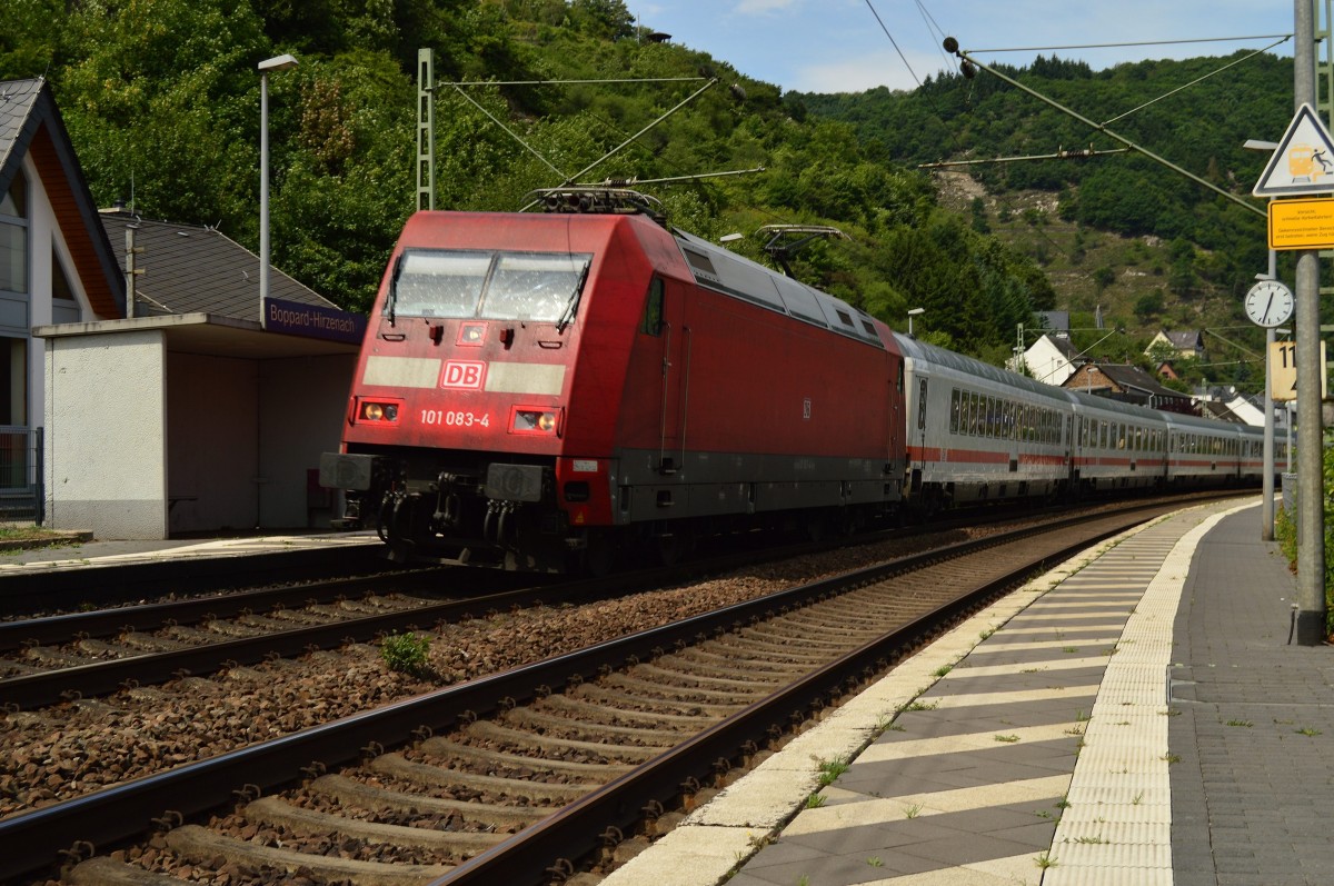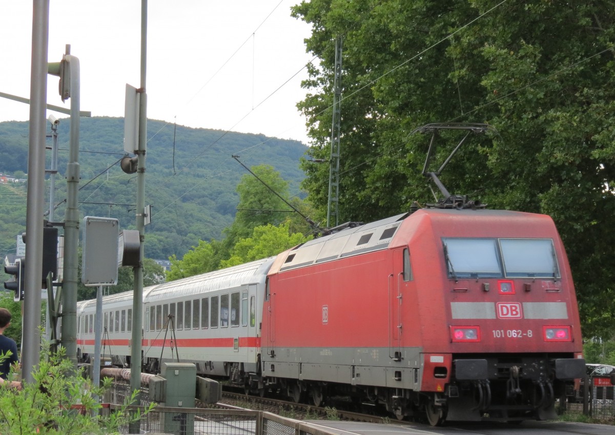 101 062 bringt ihren EC114 von Klagenfurt nach Dortmund und fährt hier durch Bingen. Juli 2014.