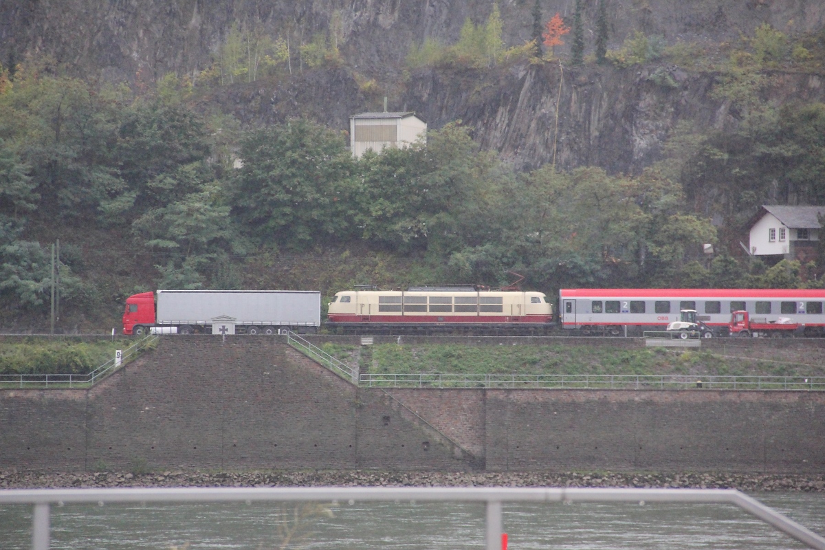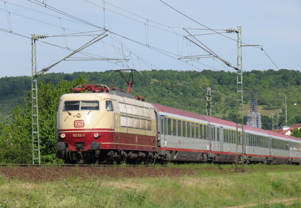103 113-7 bringt den IC118 von Stuttgart nach Münster, hier befindet sie sich gerade zwischen Mainz und Bingen. Mai 2014.