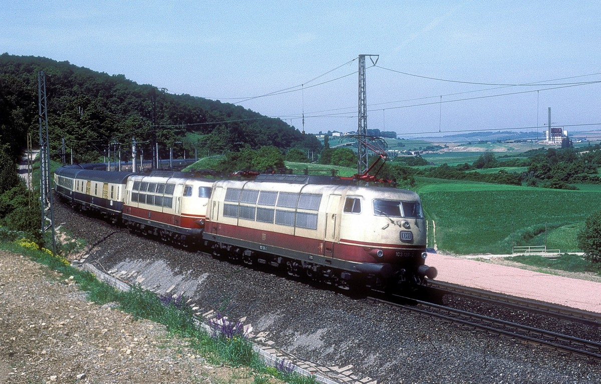 103234 am 13.7.1987 um 17.45 Uhr in Tecklenburg - Leeden mit Intercity 609 "Heinrich Heine" nach Frankfurt.
