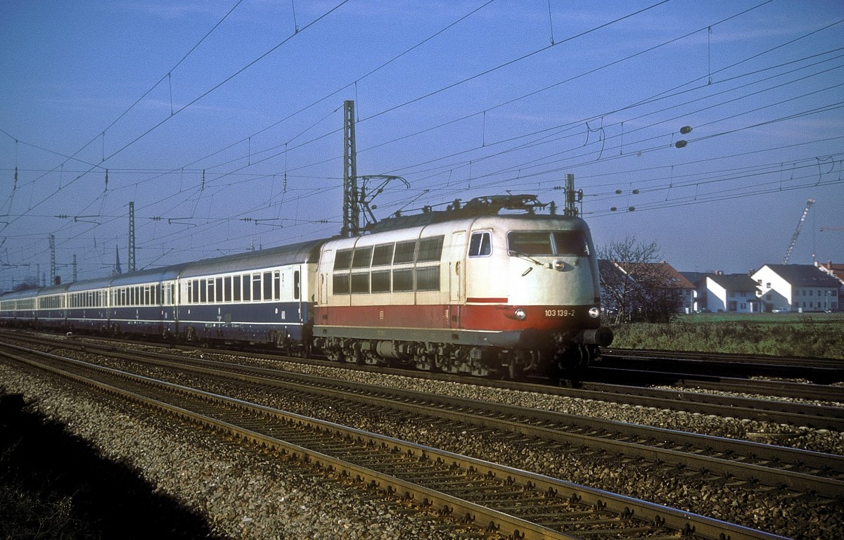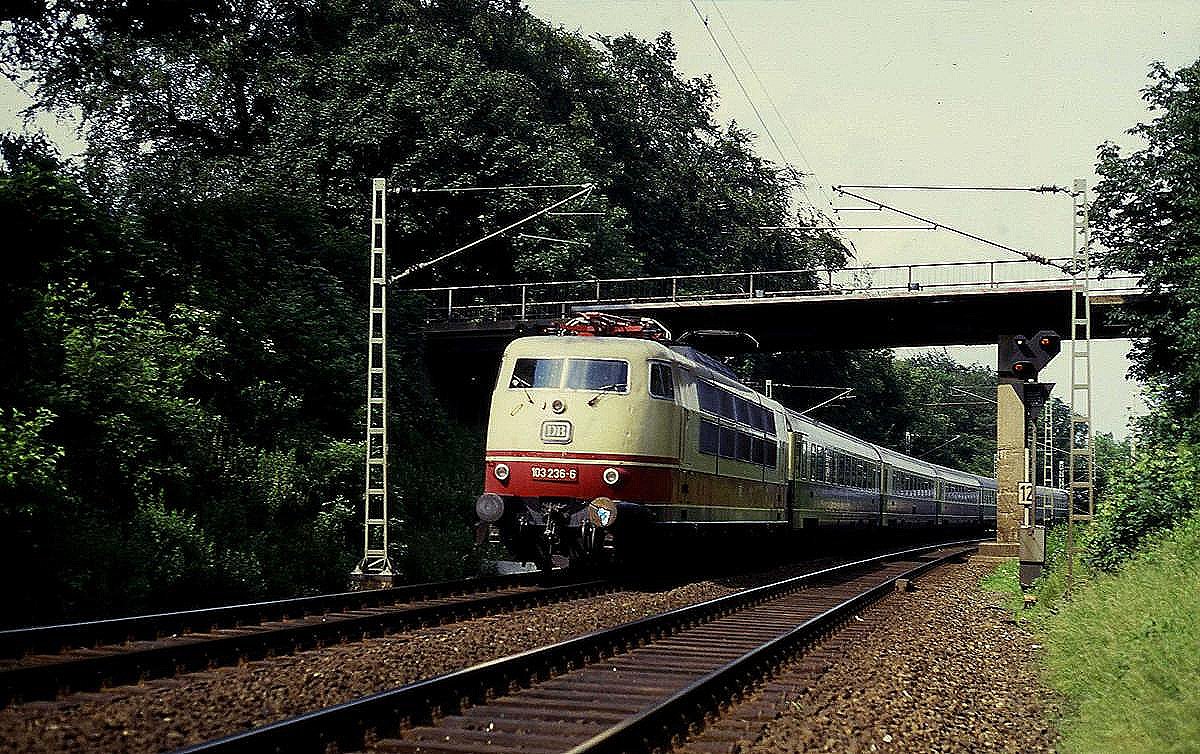 103236 mit EC 30 "Merkur" am 2.7.1987 um 16.53 Uhr in Hasbergen Richtung Münster.