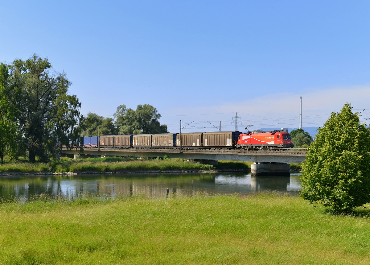 1116 072 mit dem Mercedeszug am 11.06.2014 auf der Isarbrücke bei Plattling.