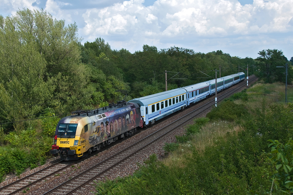 1116 153 "ÖAMTC" ist mit EC 103 bei Strasshof an der Nordbahn unterwegs. Die Aufnahme entstand am 26.07.2014.