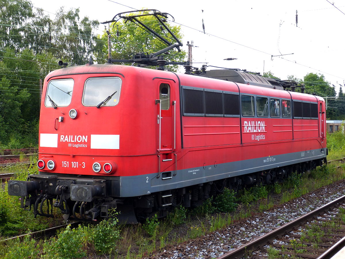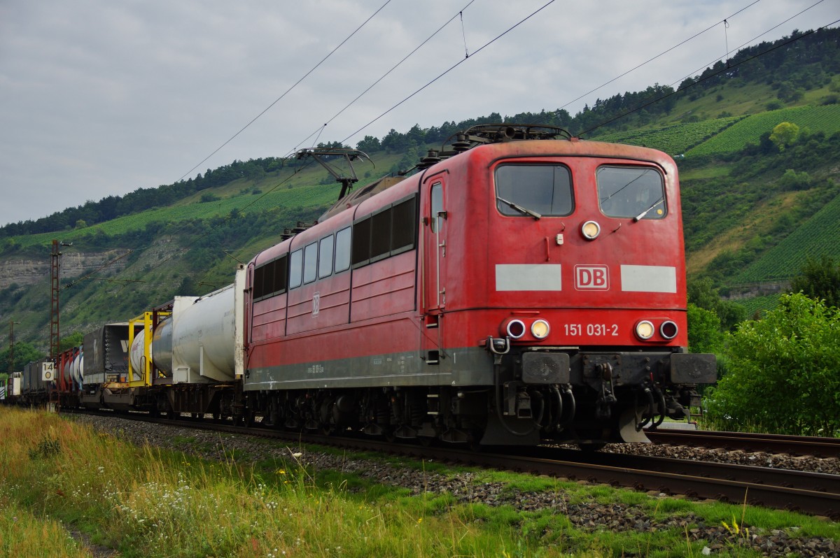 151 031-2 ist am 16.07.14 mit einen Aufliegerzug bei Thüngersheim unterwegs.