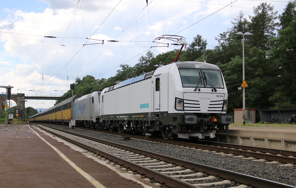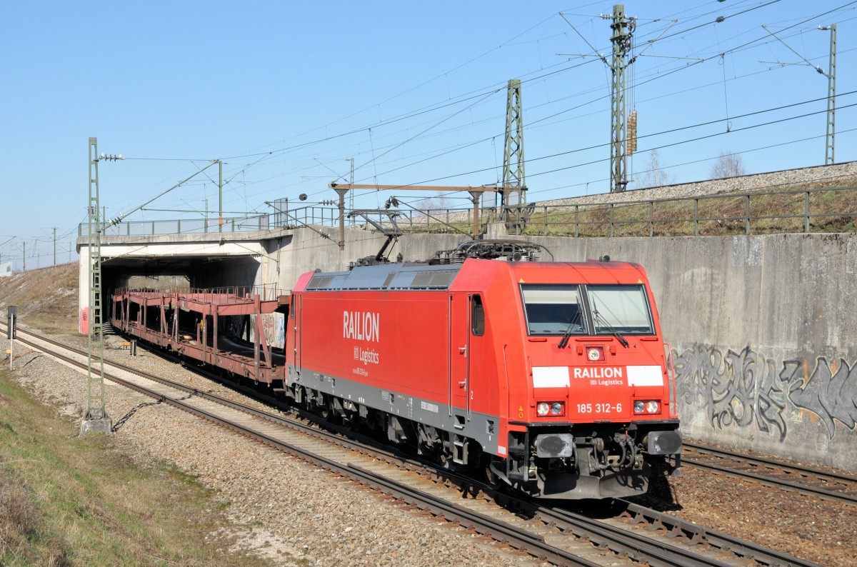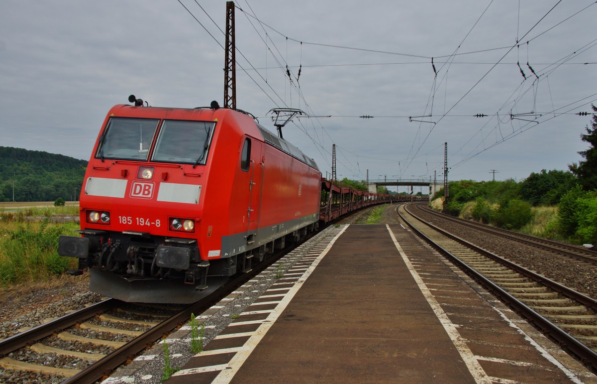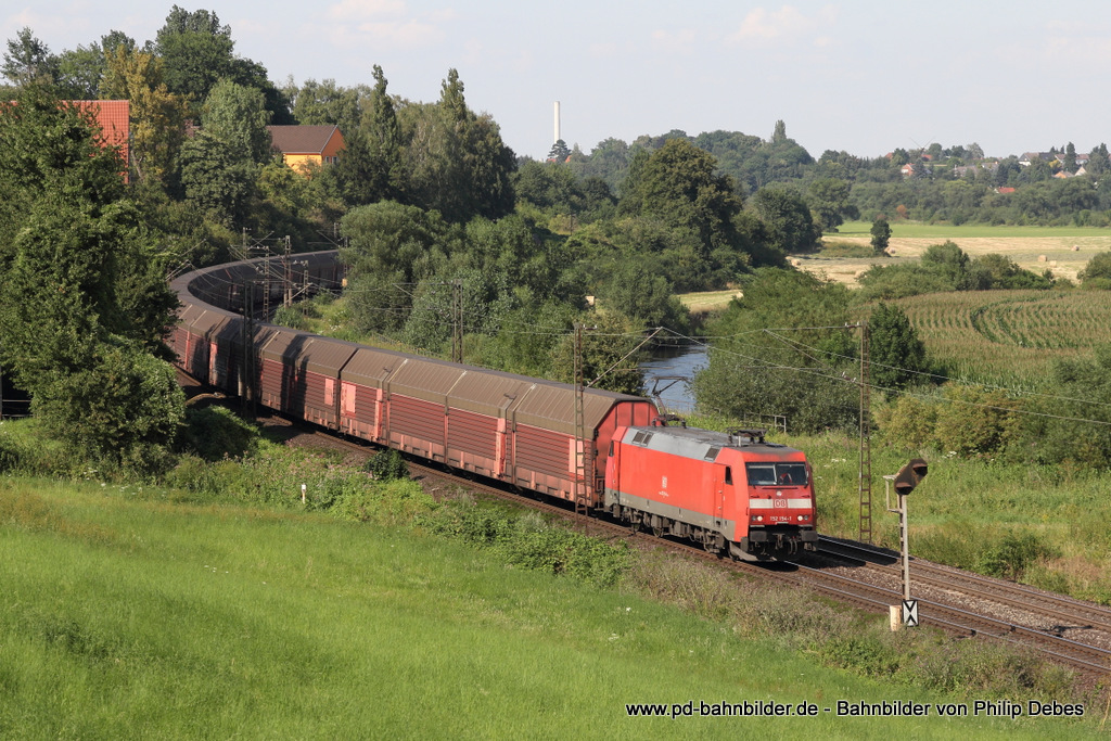 185 184-8 mit einen leeren Autozug in Retzbach-Zellingen am 16.07.14