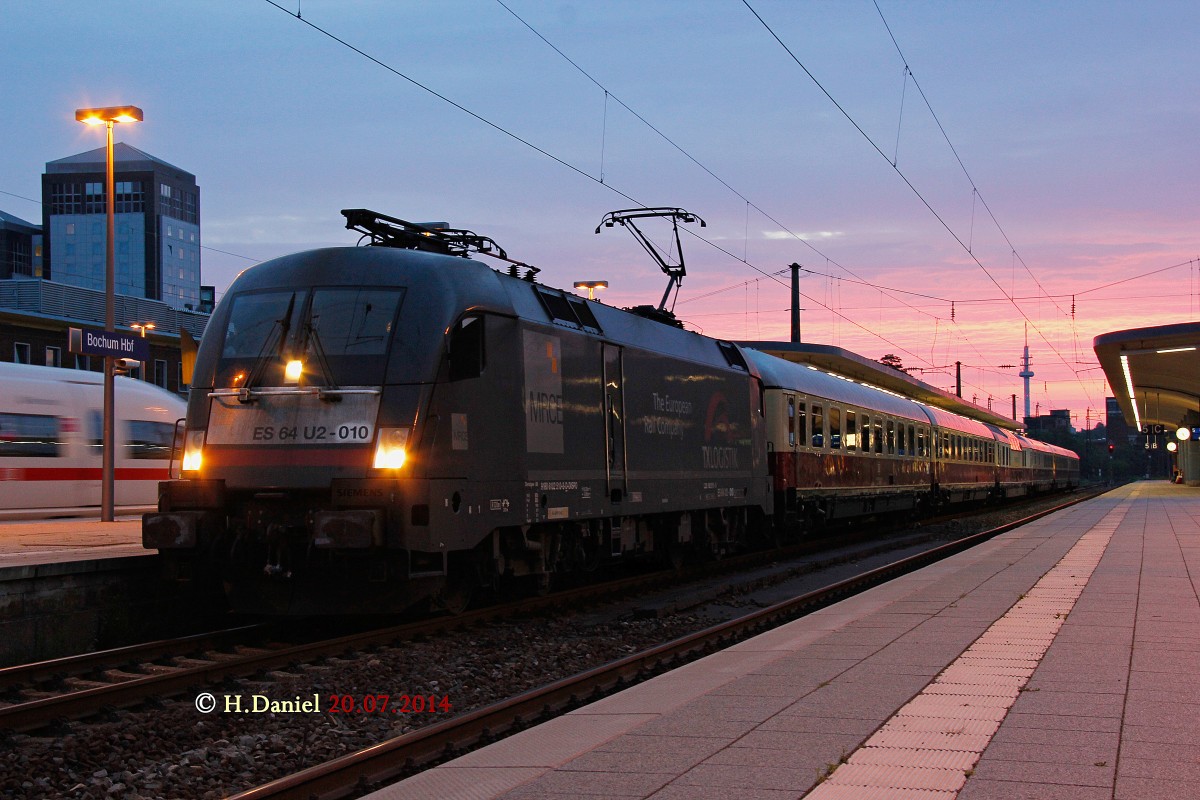 182 510/ES 6 U2-010 TXL mit dem AKE-Rheingold am 20.07.2014 in Bochum Hbf und fuhr weiter nach Würzburg. Um 06:00 Uhr ging im Hintergrund die Sonne auf.