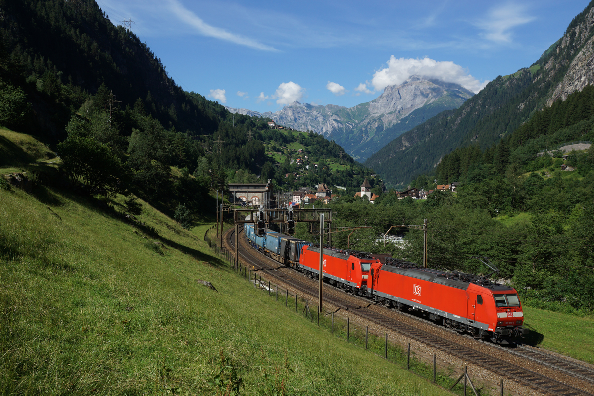 185 101 + 185 1xx mit einem Containerzug am 28.08.2012 oberhalb von Wassen.