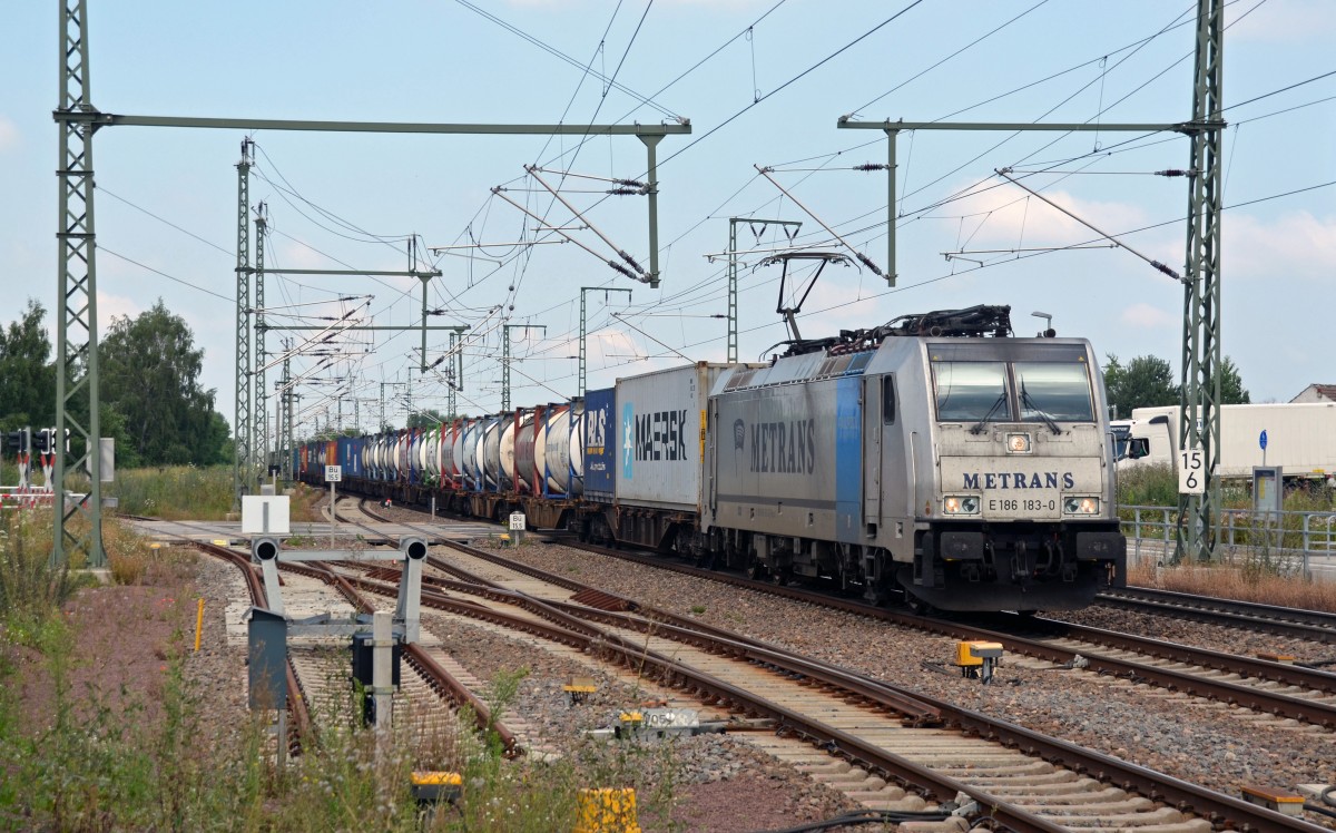 186 183 der Metrans führte am 10.07.14 einen Containerzug durch Rodleben Richtung Wittenberg.