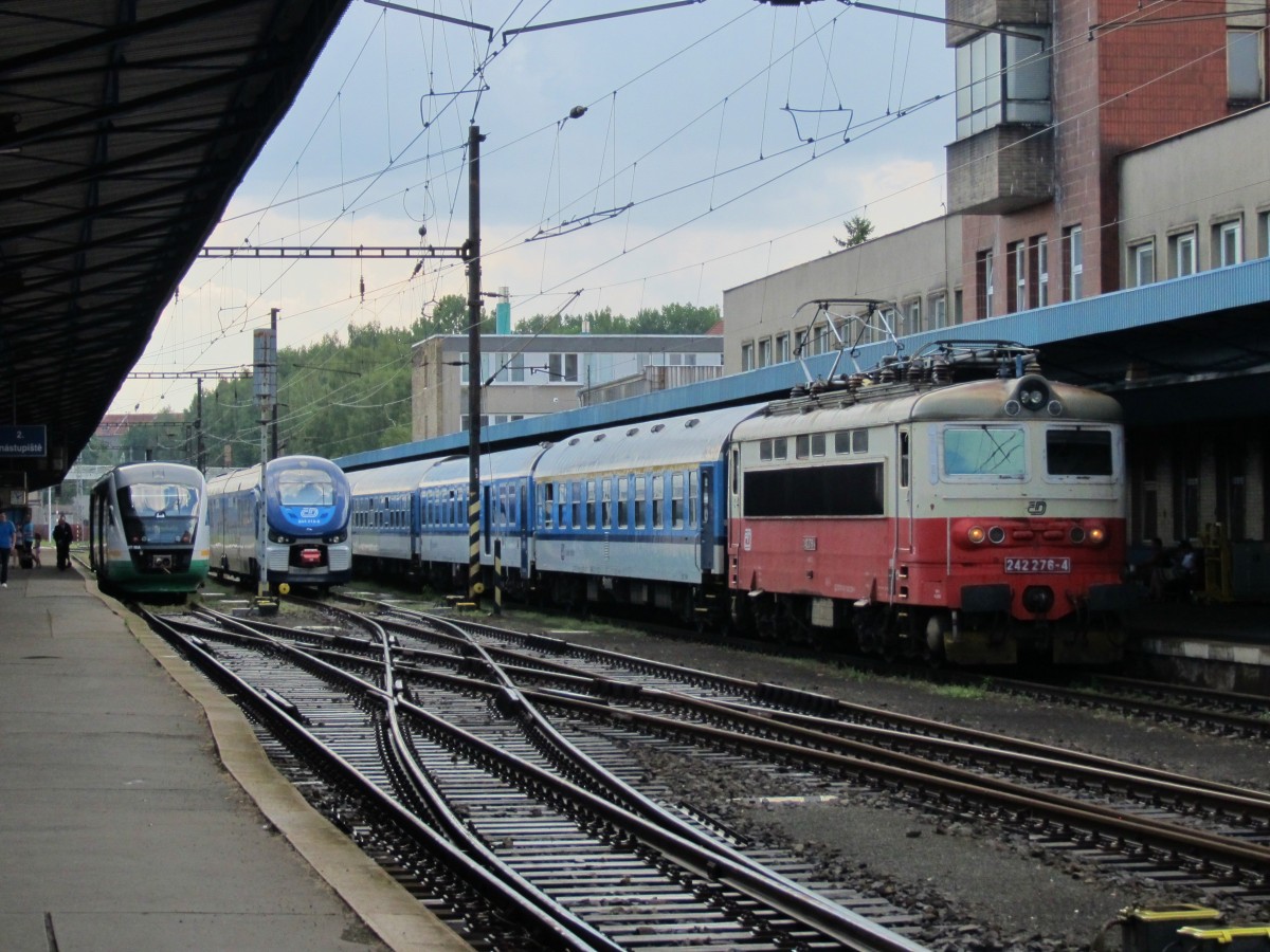 23.7.2014 13:55 ČD 242 276-4 mit einem Schnellzug (R) nach Praha hl.n. im Startbahnhof Cheb. Links abgestellter Triebzug ČD 844 016-6 "RegioShark". Ganz links VT 19 der Vogtlandbahn nach Marktredwitz.