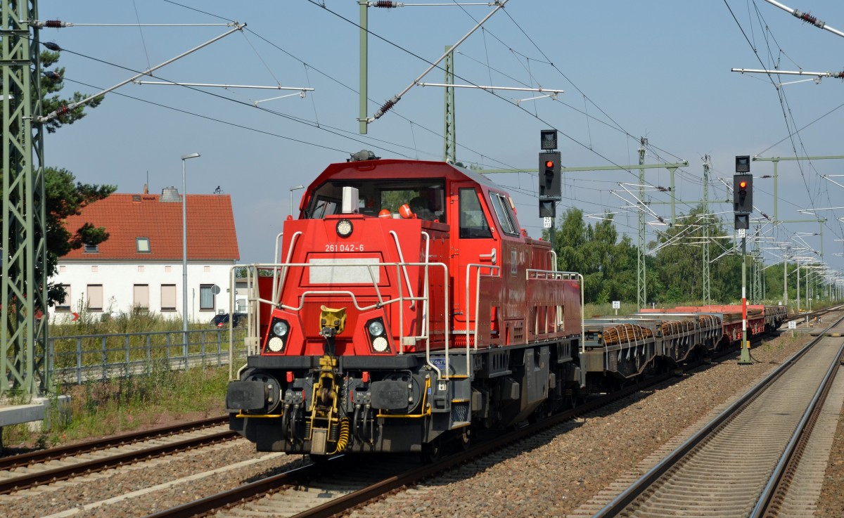 261 042 zog am 10.07.14 einige mit Stahlplatten beladene Schwerlastwagen durch Rodleben Richtung Dessau.