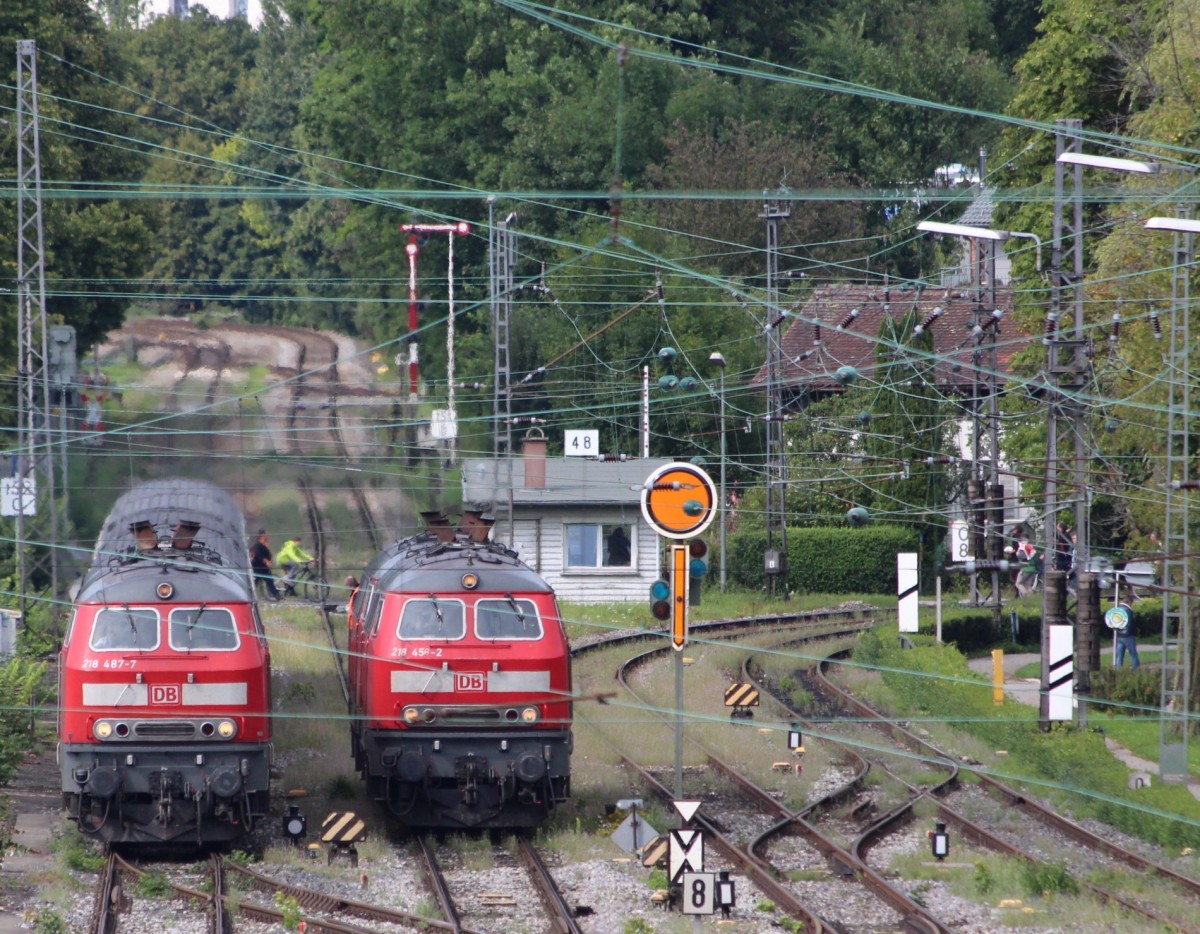 27.7.2014, Lindau Hbf. 218 487 und 476 mit IC 119 passieren 218 456 + 495, die zum Abstellen umsetzen.