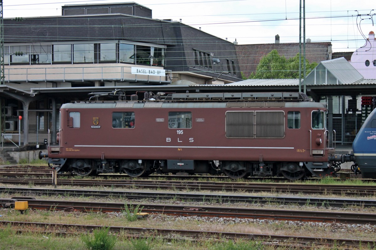 Am 04.05.2014 stand von BLS Cargo die Re 425 195 auf einem angemietetn Abstellgleis in Basel Bad Bf mit weiteren Loks und wartet auf ihren nächsten Einsatz.