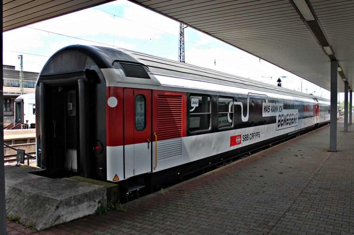 Am 04.05.2014 standen diese zwei Wagen des SBB Schul- und Erlebniszug am Bahnsteig zwischen Gleis 4 und 5 in Basel Bad Bf.