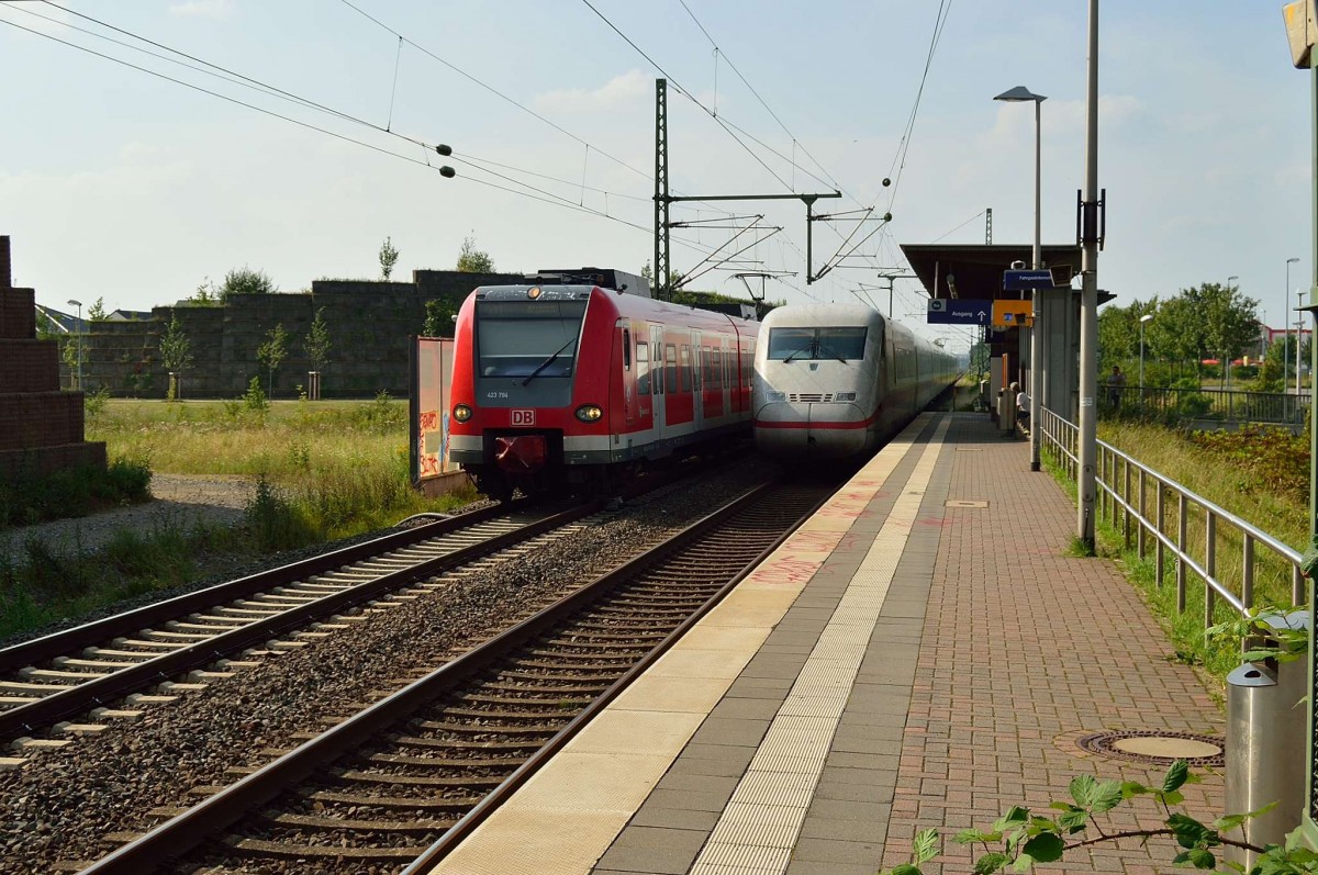 Begenung des ICE2 Rheinsberg und des 423 794 der als S11 nach Bergisch Gladbach unterwegs ist. Am Samstag den 26.7.2014