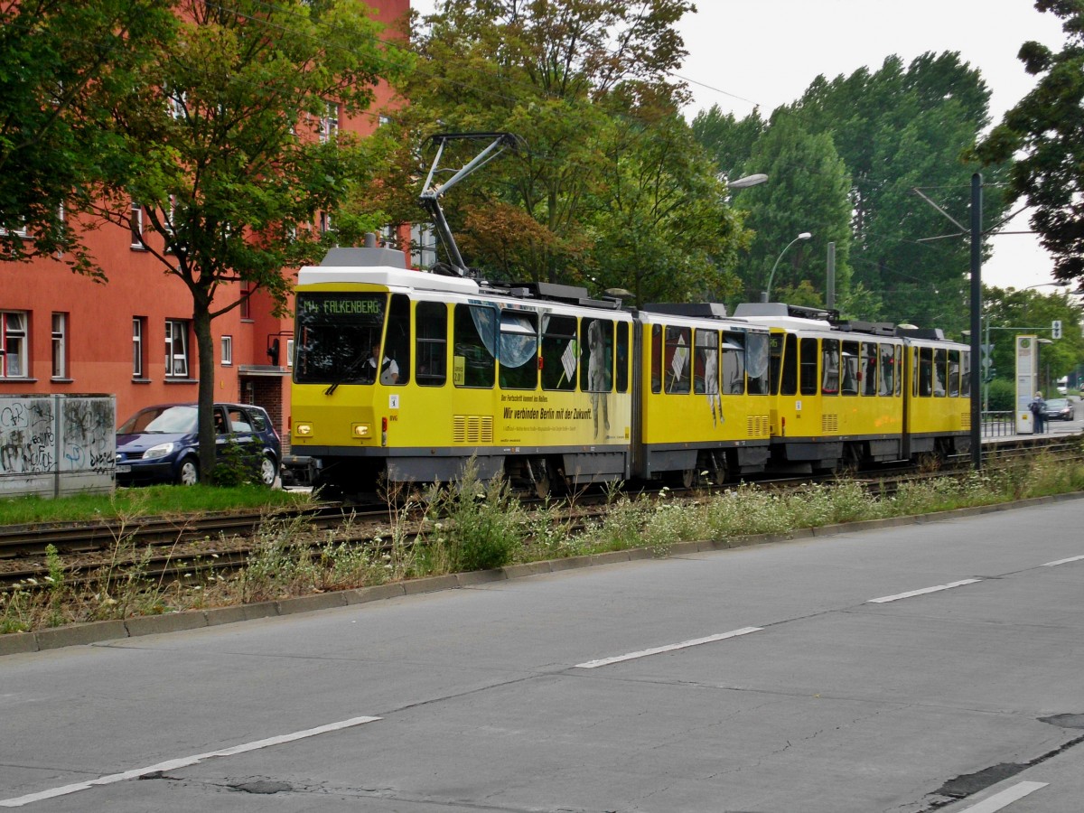 Berlin: Straßenbahnlinie M4 nach Falkenberg an der Haltestelle Weißensee Buschallee.(25.7.2014)