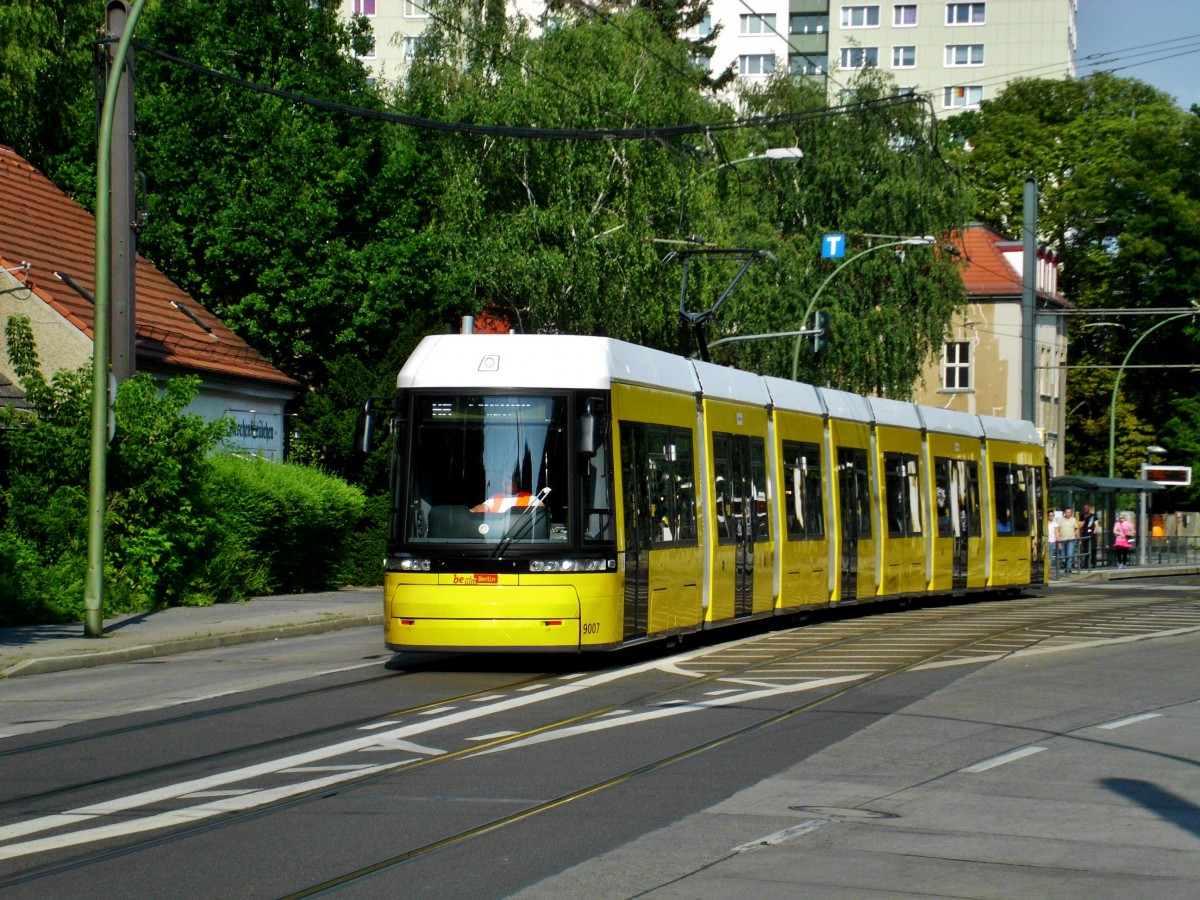 Berlin: Straßenbahnlinie M5 nach S-Bahnhof Hackescher Markt an der Haltestelle Hohenschönhausen Hauptstraße/Rhinstraße.(26.7.2014)