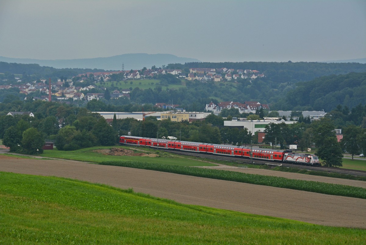 Das neue Herz Europas alias 146 227 schleicht sich mit RE 19210 nach Stuttgart HBF auf leisen Sohlen durch das Filstal.Uhingen 26.7.2014