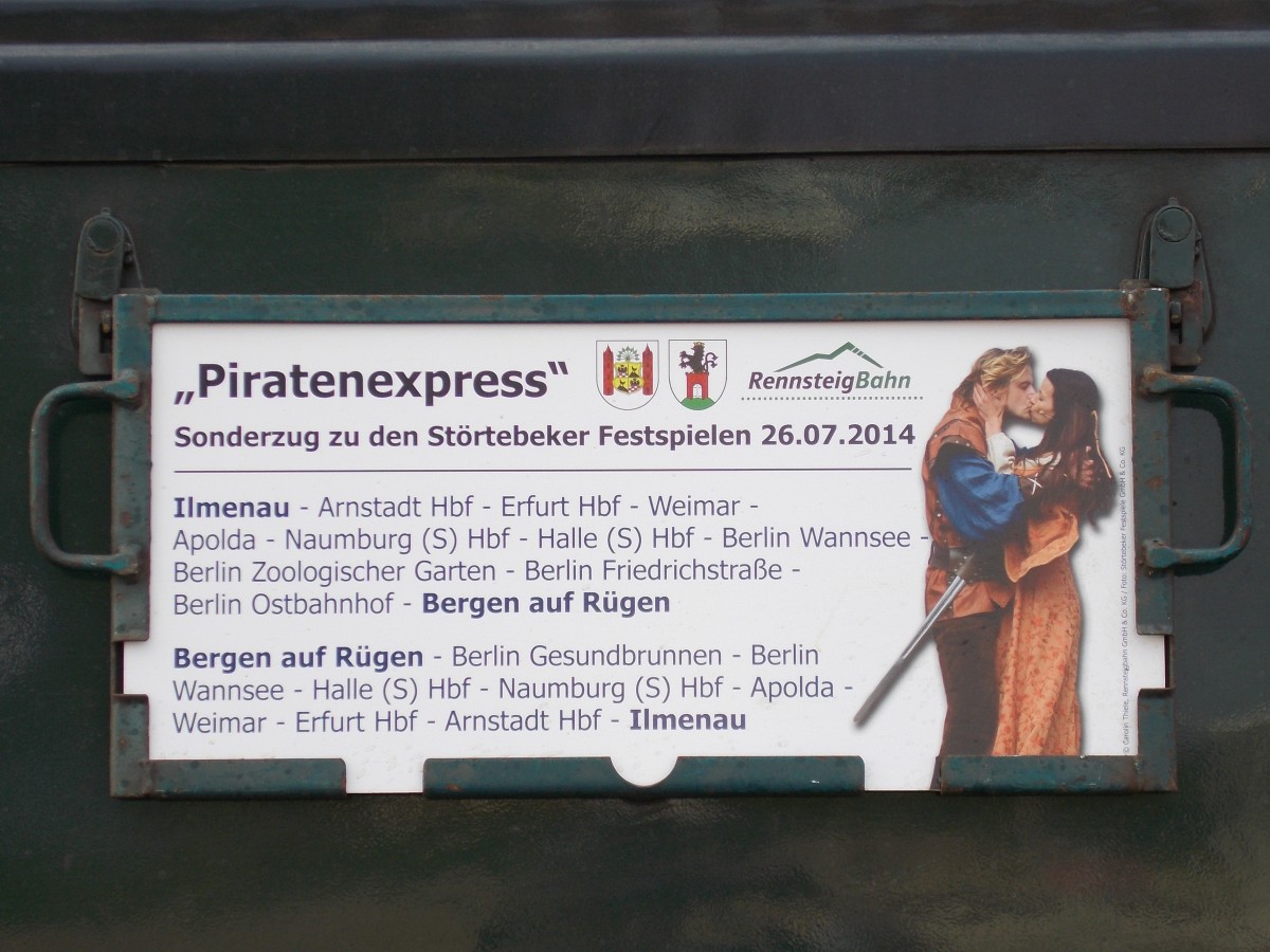 Das Zuglaufschild für den Piratenexpress von und nach Ilmenau der,am 26.Juli 2014 nach Bergen/Rügen kam.