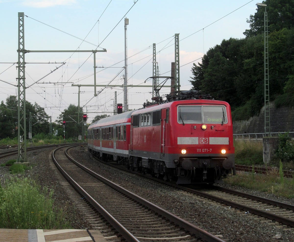 Die Münchener 111 071-7 erreicht am 25. Juli 2014 mit einer Regionalbahn aus Bamberg den Endbahnhof Kronach auf Gleis 4.