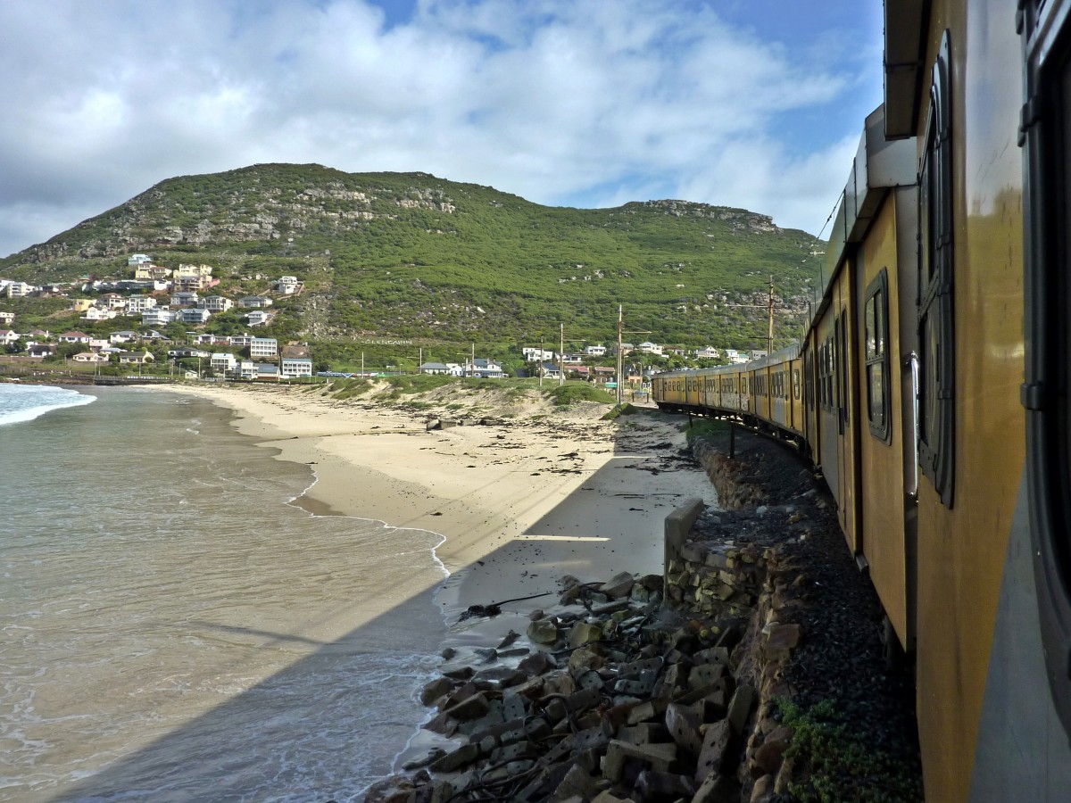 Ein 10M3 fährt am 26.07.2014 in den Bahnhof Simonstown ein. Da der Bahnhof direkt am Strand liegt sind einige der Gleise recht versandet.