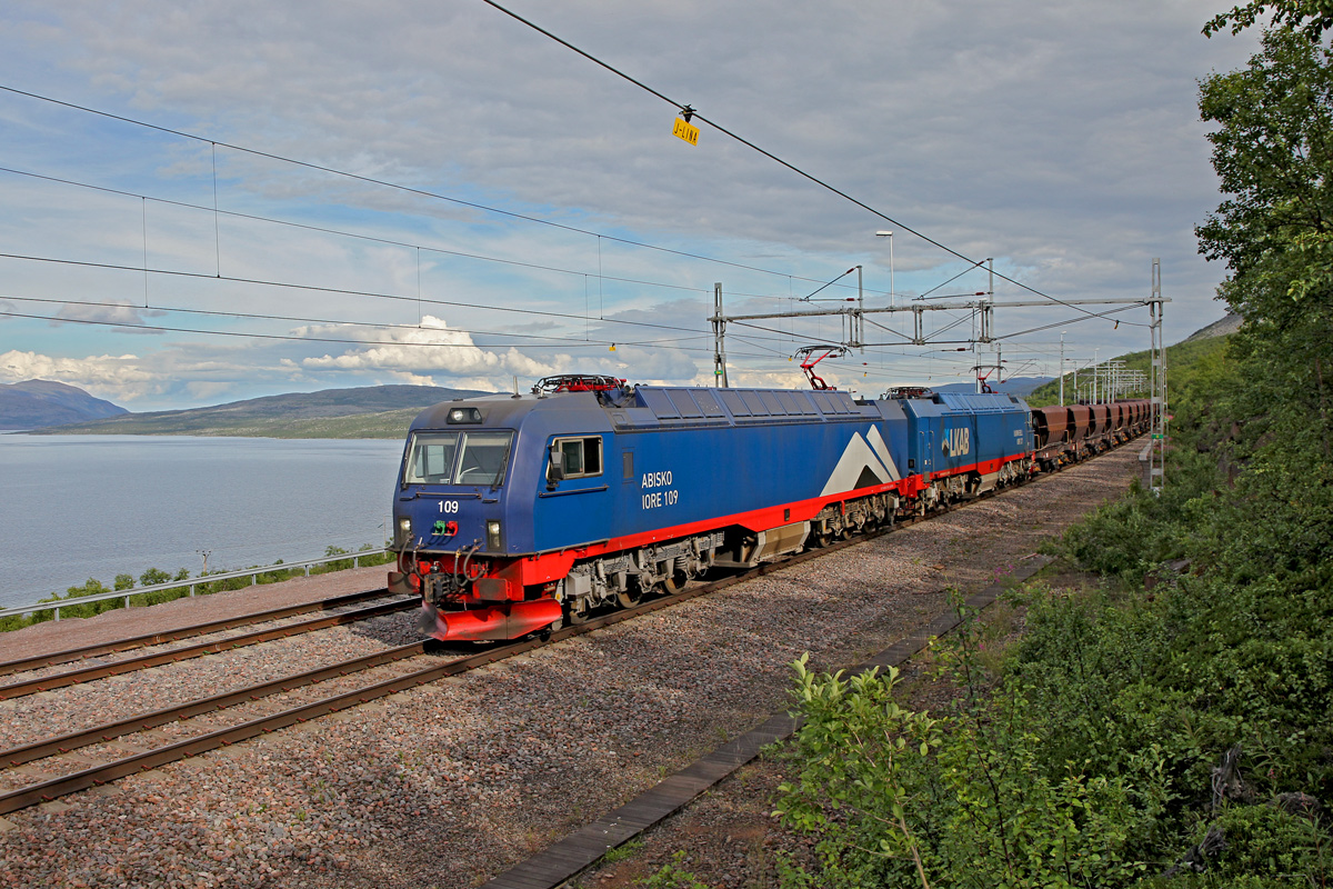 IORE Loks Abisko 109 und Bjornfjell 127 kommen mit vollem Erzzug bei Kebnekaise vorbei.Bild vom 18.7.2014