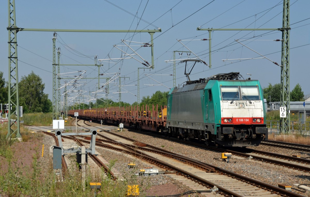 Mit einem unbeladenen Langschienenzug rollte 186 134 der ITL durch Rodleben Richtung Wittenberg.