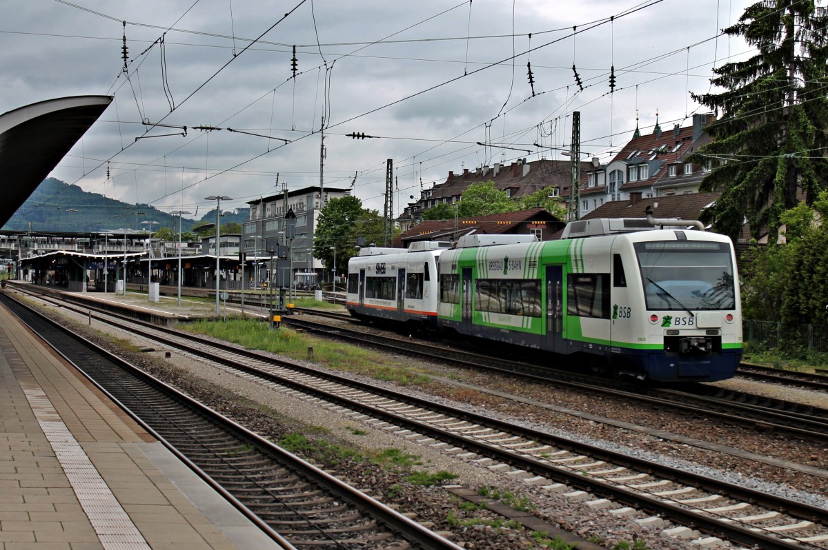 Nachschuss am 03.05.2014 auf BSB 003 (650 030-9) als S-Bahn aus Breisach bei der Einfahrt mit SWEG 506 (650 600-9) in den Zielbahnhof.