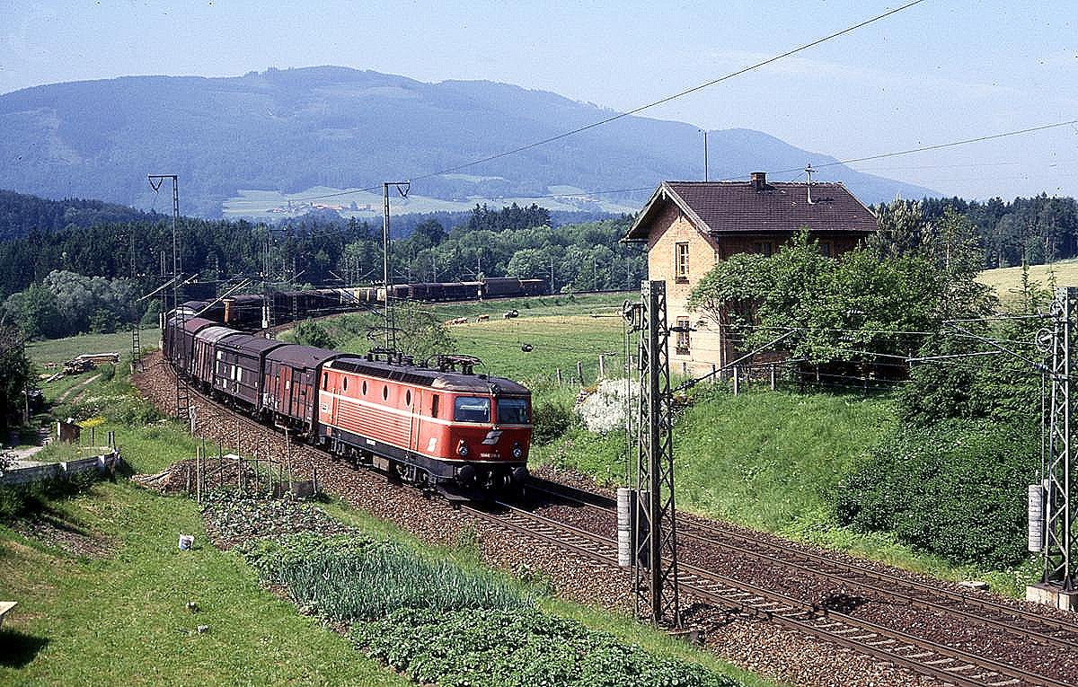 ÖBB 1044.016 am 13. Juni 1987 um 11.02 Uhr mit einem Güterzug unterwegs in Richtung Freilassing.