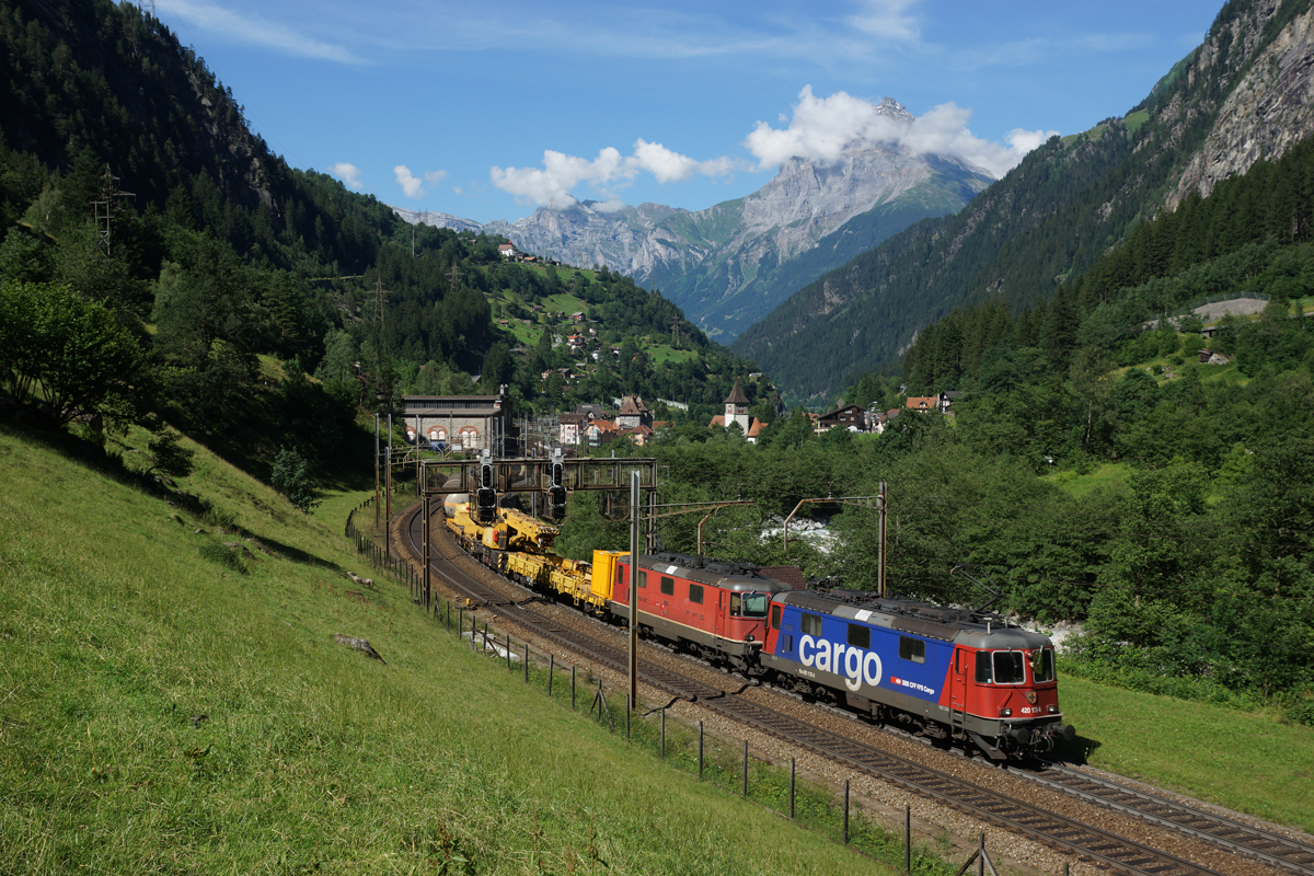 Re 420 178-6 und Re 4/4 II 11234 ziehen am 03.07.2014 einen Bauzug von Gurtnellen Richtung Wassen.