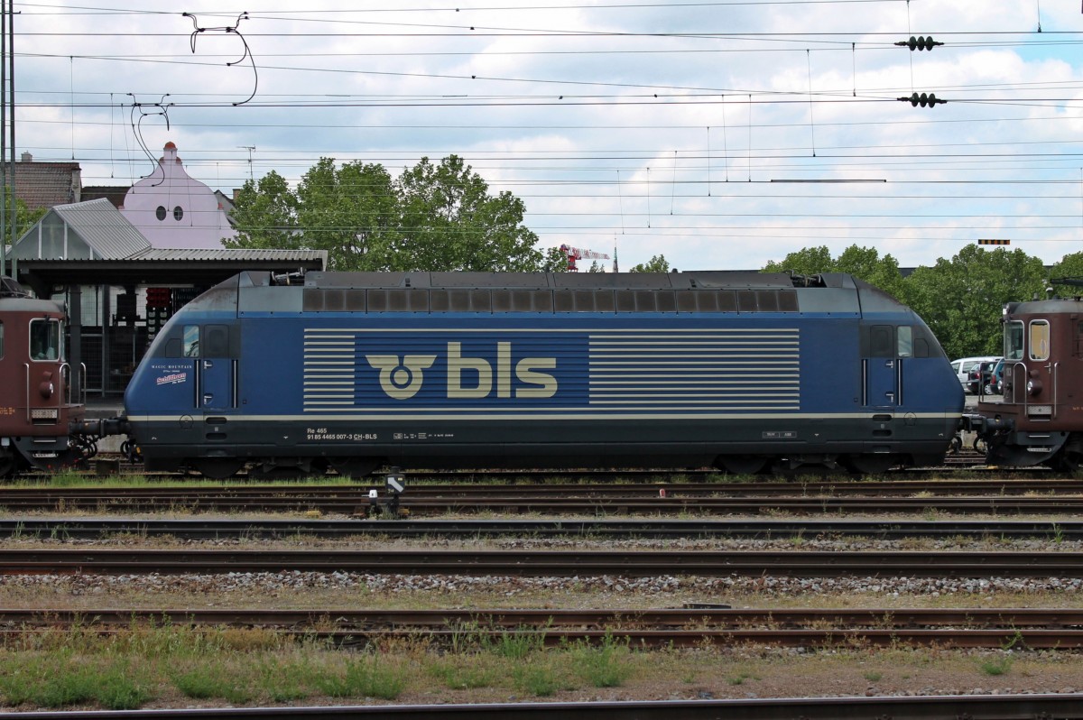 Seitenansicht von BLS Cargo Re 465 007-3 am 04.05.2014, als sie zusammen mit anderen BLS Cargo Loks auf einem angemieteten Abstellgleis in Basel Bad Bf auf ihren nächsten Zug wartet.