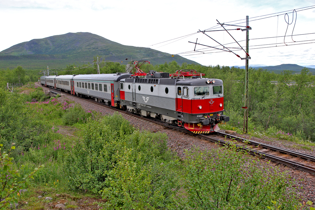 Sj Lok Rc6 1327 kommt am 18.7.2014 mit dem Ic 95 nach Lulea bei Rensjön vorbei.
